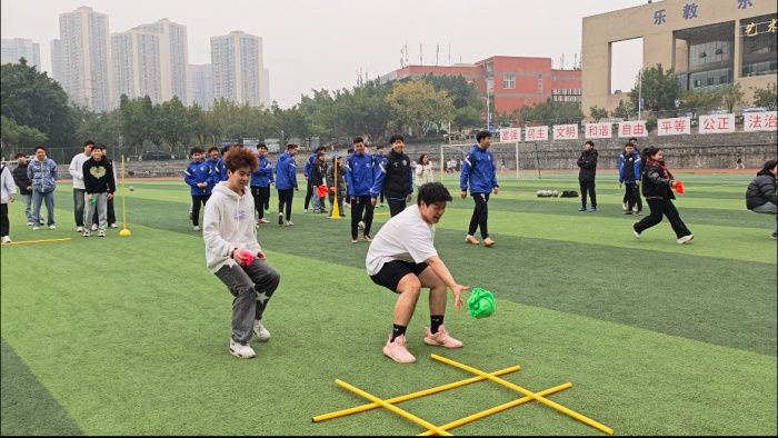 活动伊始,张教练带领同学们进行了一些简单的热身活动,对身体进行了充分的拉伸。第一项活动名叫“棋圣-九宫格”,将参与的同学分成两队且给每队3件同色对抗服。吹哨开始从起点出发接力完成九宫格的连线。这项活动不仅很好的激发了大家的竞争欲望和思考能力,还很好地模拟了在赛场上的决策能力。第二项活动的名字是“抓尾巴”,由校队队员进行了活动规则介绍后,同学们将对抗服当尾巴,在区域内进行对抗赛,锻炼了同学们的盘带以及观察能力。在欢声笑语中同学们又参与了“足球糖豆人”和“踢球打靶”的游戏,足球爱好者乐在其中。