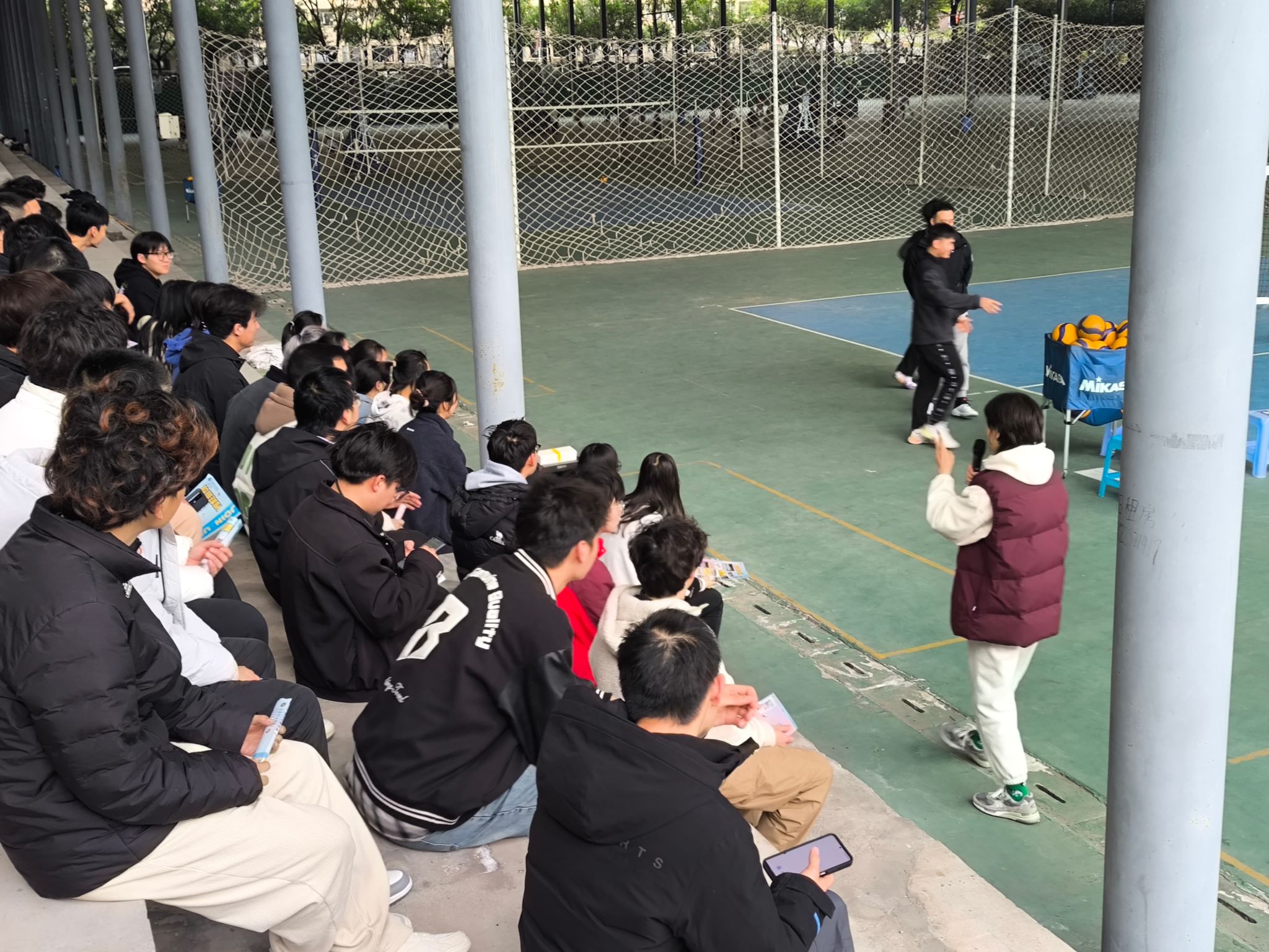 本周三下午,校男、女排球队在风雨球场开展了本学期的校队开放日活动,本次活动共有30余名同学报名参加,亲临现场观摩排球队训练日常,与校队队员们近距离交流互动。