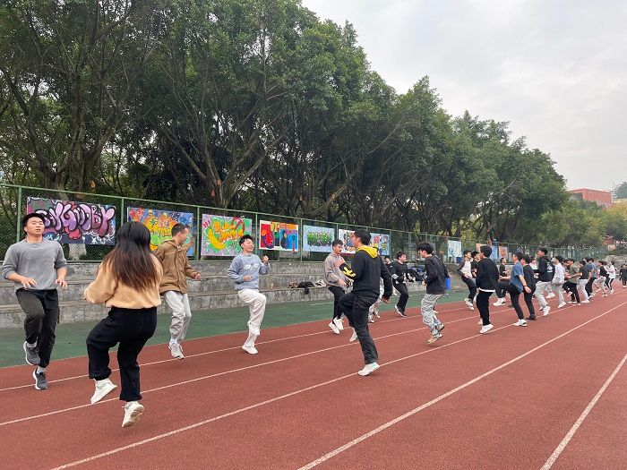 二、互动体验:教练带领学生进行训练前的热身,并讲解标准的训练技术动作、注意事项。在运动过程中,教练不断激励学生们要坚持。汗水迎风挥晒,同学们热情不减,在开放日训练学生参与了耐力、力量、技巧、速度方面的训练,进一步提升学生的身体素质和运动水平,培养积极拼搏的体育竞技精神。