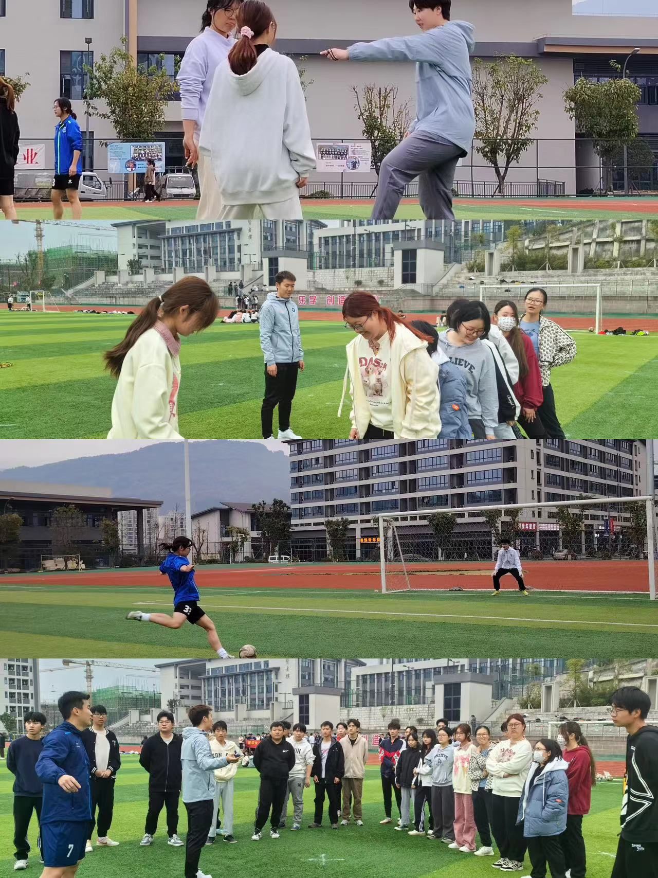 两位教练简单介绍了校足球队是如何从一支“杂牌军”,演变成如今的“正规部队”。 随后让同学们观摩了校足球代表队简单的基本技术训练,在感叹校队成员成长的同时,教练也带着大家一起参与其中;通过一系列足球小游戏拉进彼此距离,同时也让同学们在愉快的氛围中感受到足球所带来的乐趣。