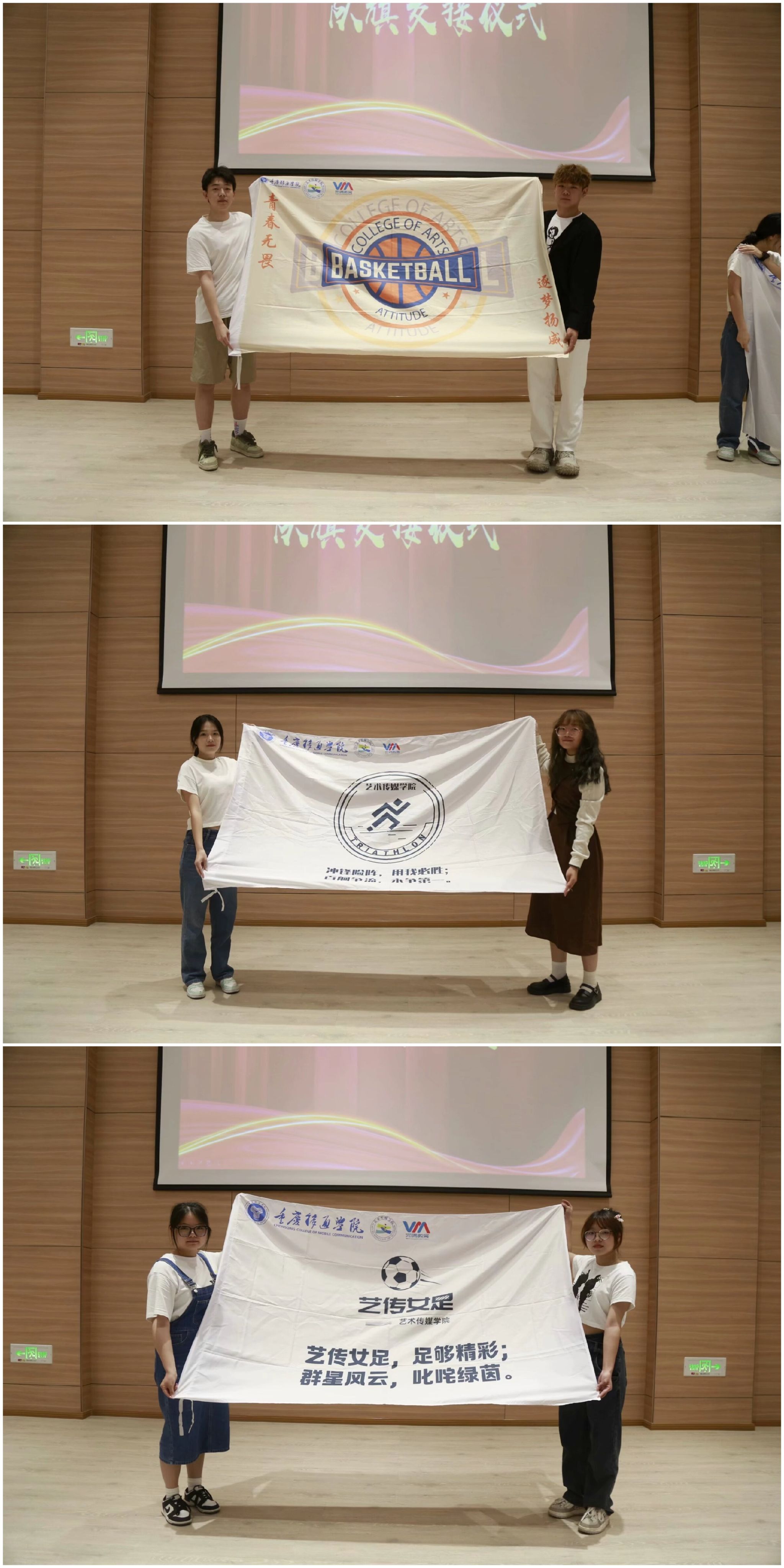 队旗传承,使命接力。队旗,是一支队伍精神的代表,艺传篮球队、足球队和铁三队伍的新老队长进行了队旗交接仪式。老队长们依次将队旗郑重地交给新队长们,象征着责任和使命的传递。这一刻,全场掌声雷动,为新老队长们的“传承与接力”送上最美好的祝福。