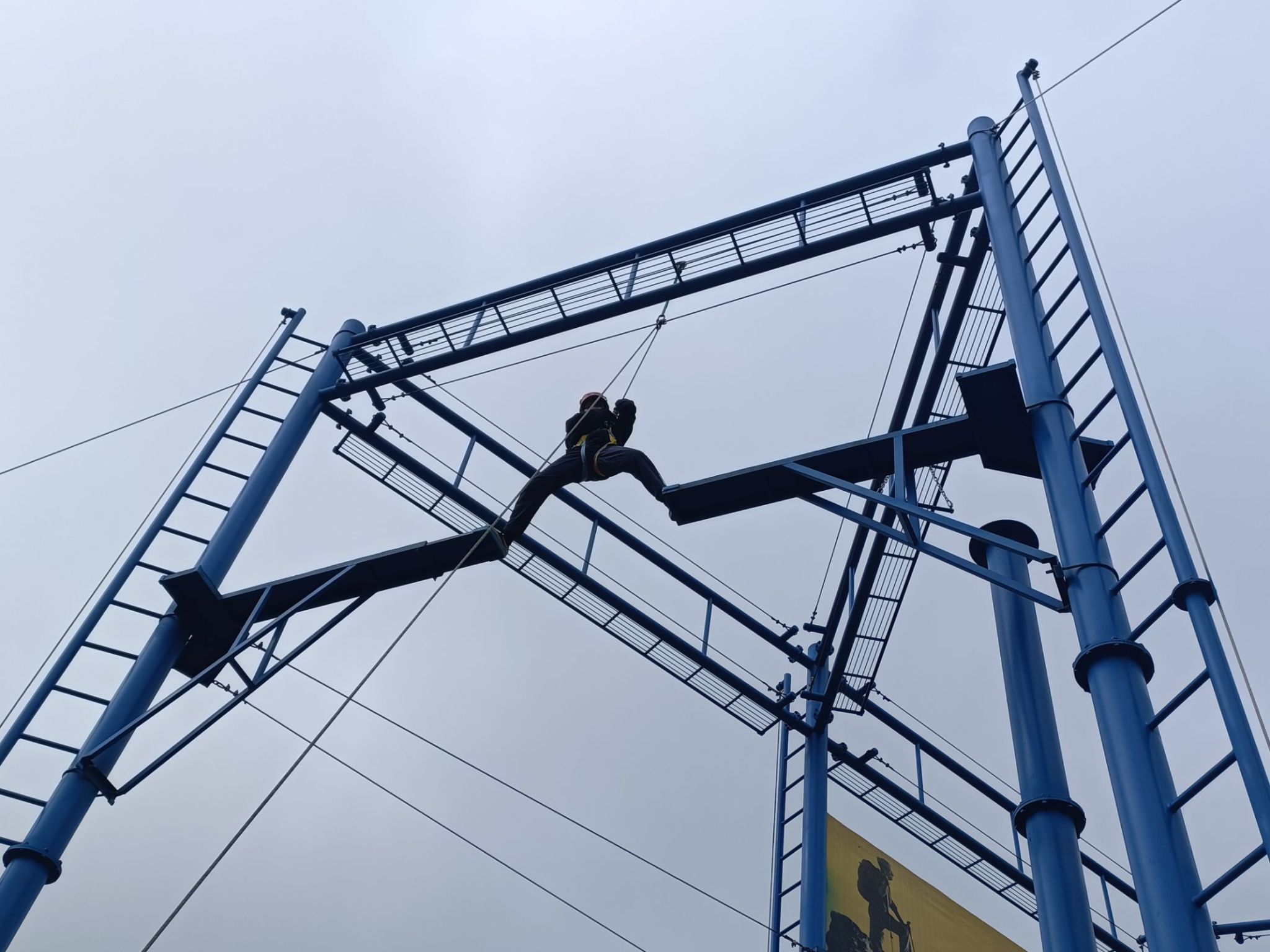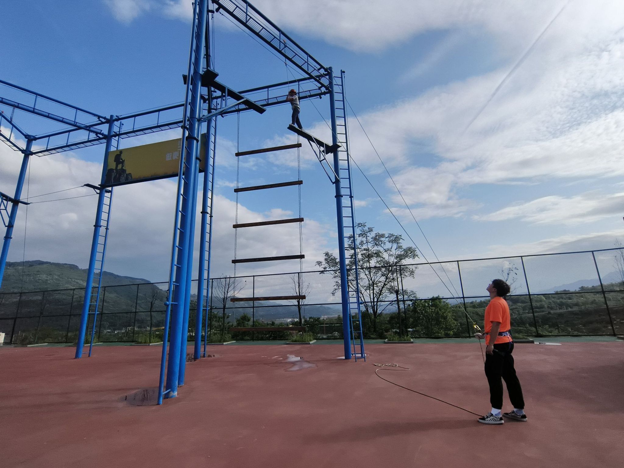 在营地拓展训练课程中,同学们被分成了6个小队,每个小队都有着自己独特的队名口号以及队歌,大家的创意都很新颖。教练带领同学们感受“高空断桥”项目。队员们穿戴好装备过后,使用铁梯爬上高空,站在一个断桥上面,然后一脚跨越到对面断桥。完成之一操作过后就在两个断桥上扎一个一字马,很多同学都很畏惧,但是同学们都很棒,在教练的鼓励下勇敢地完成了。这次体验让同学们深刻体会到,只有走出舒适圈,才能迎接更大的挑战。