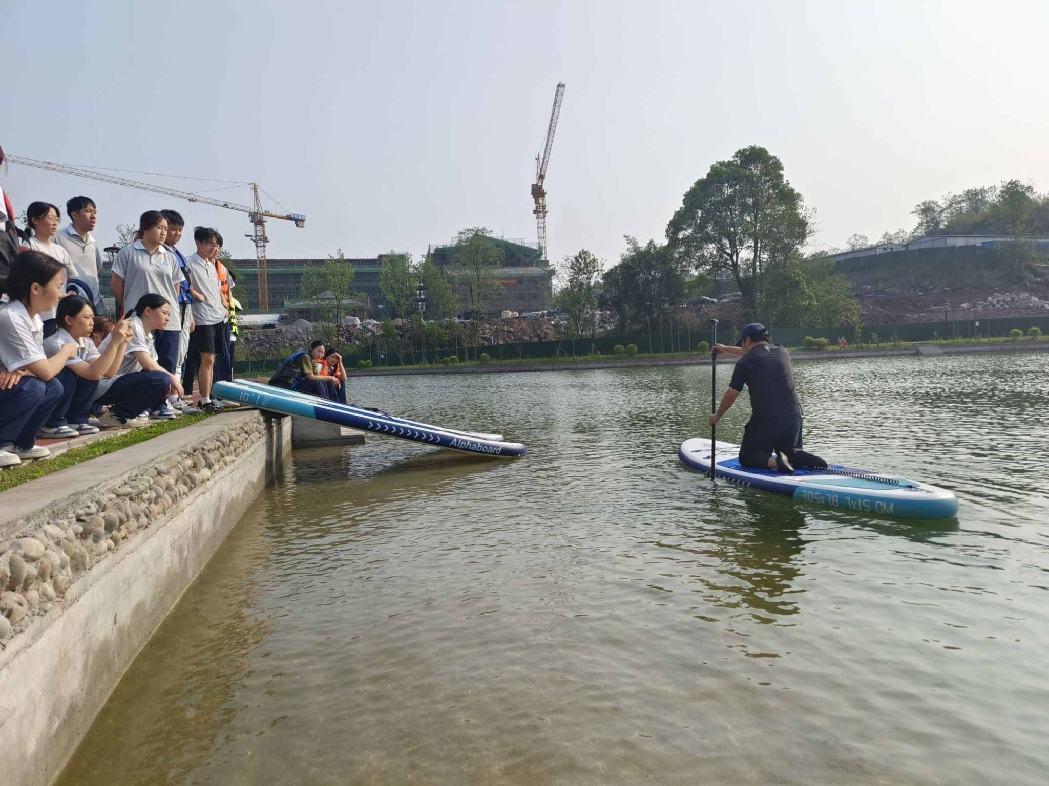 在进行了急救知识的熏陶后,炎热的下午,教练带上同学们前往学校的人工湖进行划桨项目。教练讲完规则以及注意事项和如何划行后,大家开始各自尝试、练习,在经过一个小时的训练后,两个小队的同学们进行比拼,每个小队往返18次,一开始两个小队进行得很焦灼,最后3小队以微弱的胜利,赢得了本次比拼。