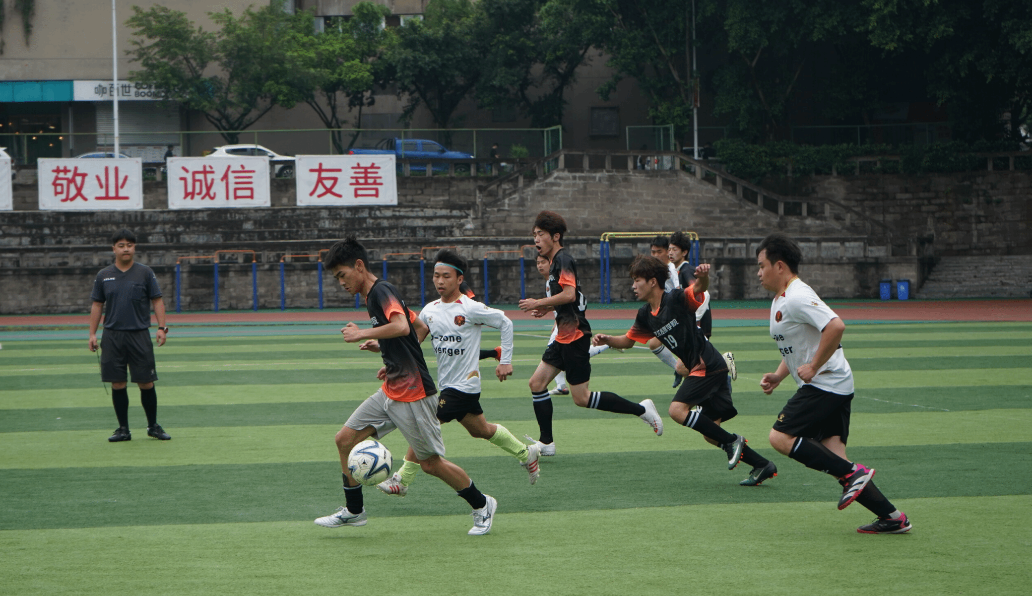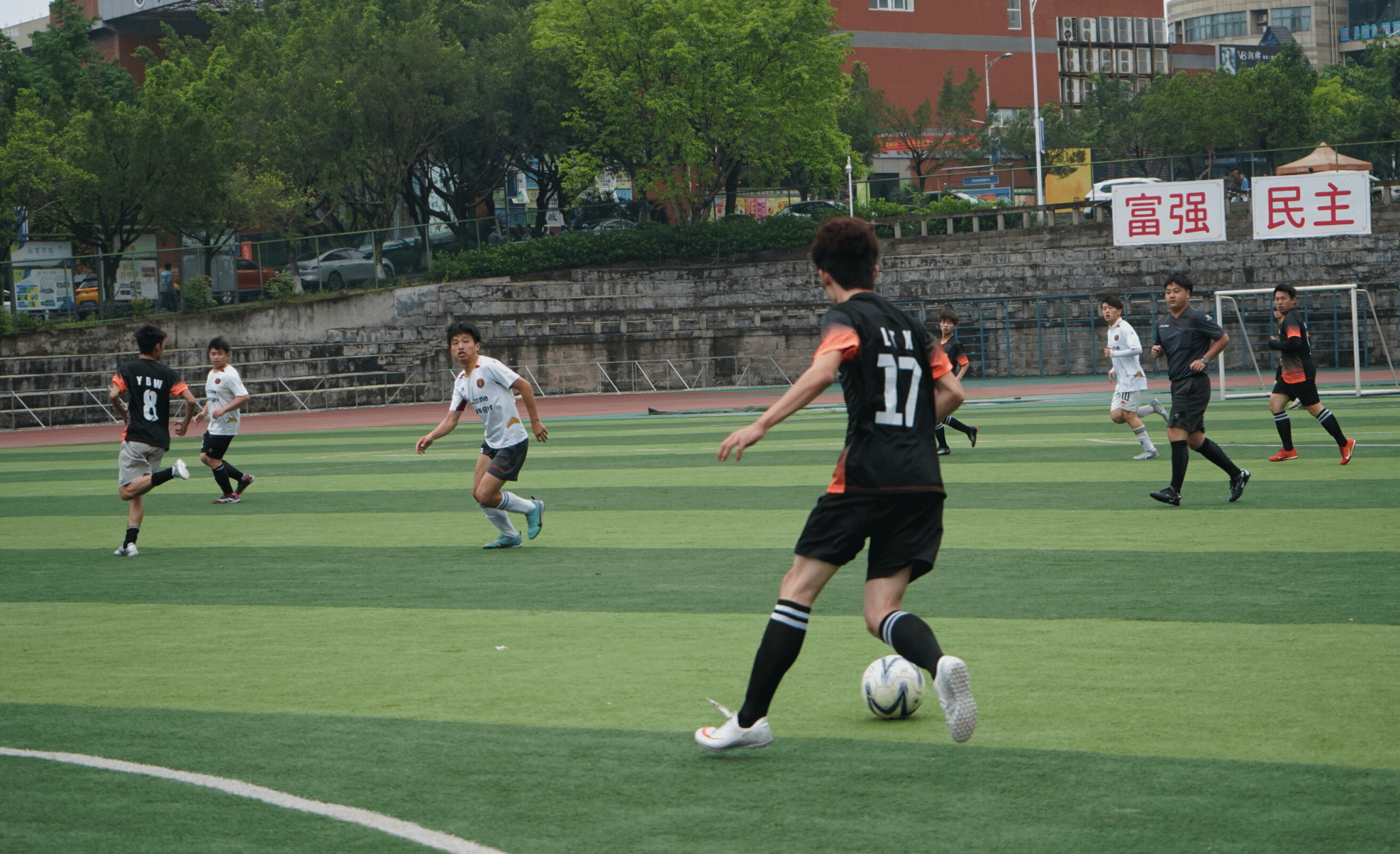 激扬青春显活力,绿荫赛场展风采2024年4月24日中午12:15,艺术传媒学院与大数据与计算机科学学院的足球比赛在山下足球场如火如荼地进行。天气阴,可球场上队员们的热情依然高涨。