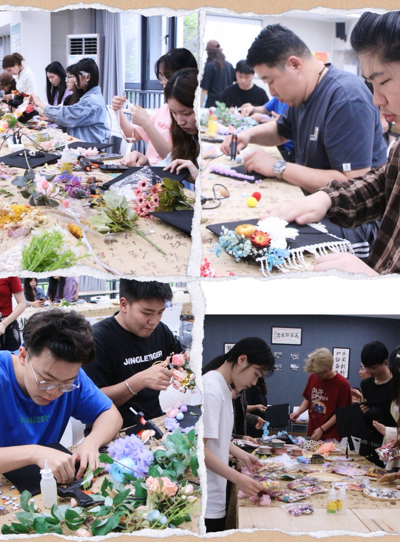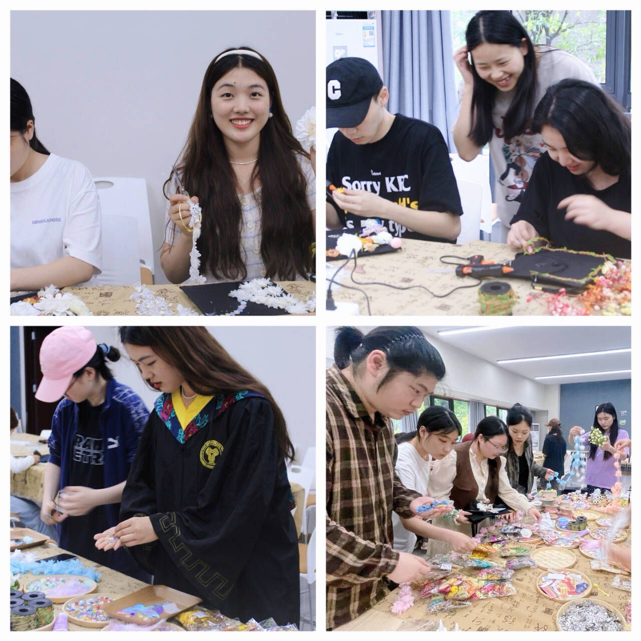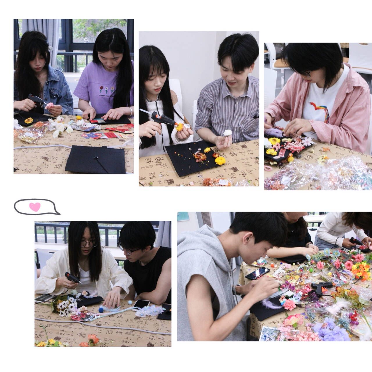 活动现场,同学们手执热熔枪,以帽为“笺”,以花为“笔”,根据个人喜好,将刺绣、绒花、蝴蝶等元素融入帽顶,设计出各具特色风格的学士帽,既有复古韵味、简约之美,也有国风之韵。