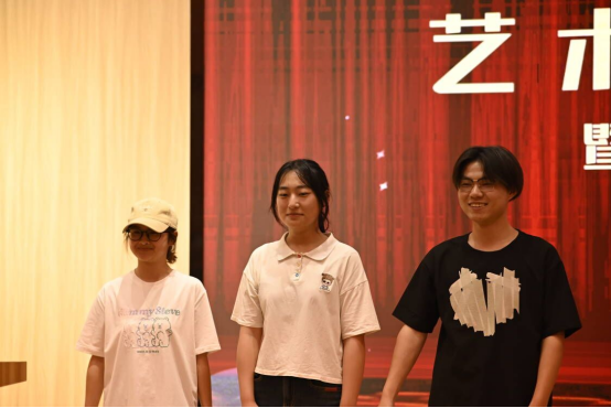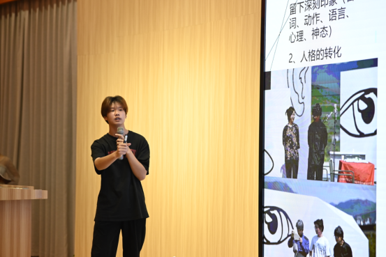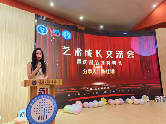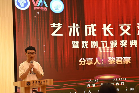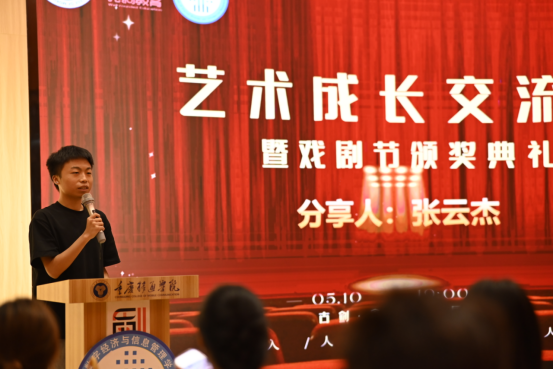 紧接着是艺术分享交流环节,来自不同部门、不同角色、不同分工的四位艺术爱好者分别代表校院两级艺术参与者分享在此次戏剧节中的心得和体会。綦迹文化产业工作室负责人,数字经济与信息管理学院2022级供应链管理专业的廖杨同学作为《郭扶欢》剧目的编剧兼导演,分享了他在剧本创作中的个人经验与感悟,通过不懈的努力和独道的见解,向观众们呈现出了一个个性格鲜明、有血有肉的剧本角色。校园原创话剧《麻乡约》的学生导演,数字经济与信息管理学院2022级数字经济专业陈佳琳同学就此次的导演心得做了分享;校流行声乐团说唱分团副团长,校园原创话剧《麻乡约》军官长官饰演者,数字经济与信息管理学院2023级数字经济专业张云杰同学从艺术成长之路作了分享,特别感谢学校学院给予的平台;我院文艺部干事,数字经济与信息管理学院2023级互联网金融专业黎君豪同学就参演原创话剧《郭扶欢》的心路历程以及成长进行交流。四位艺术爱好者的分享不仅让现场观众感受到了艺术的魅力和力量,也激发了更多同学对艺术的热爱和追求。