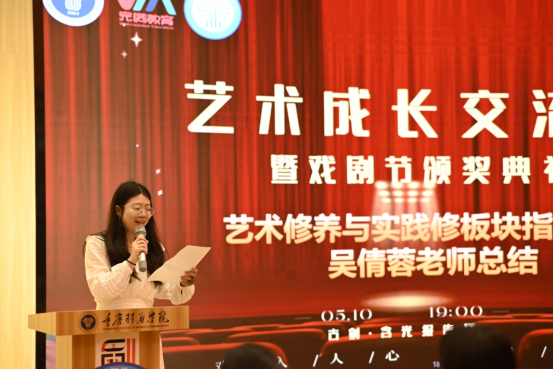 随着颁奖典礼的落幕,进入到了活动的最后一个环节——教师总结。艺术修养板块指导老师吴倩蓉老师对本次戏剧节进行了总结和回顾,并表示此次活动不仅展现了同学们的才华和风采,也促进了学院艺术教育的发展,希望未来有更多热爱艺术的同学能参与到此类活动中。随后,数字经济与信息管理学院学工副院长任瑞娟副院长对本次活动进行总结。她指出,此次活动不仅是对过去成绩的回顾,更是对未来发展的展望。通过举办这样的活动,不仅能够激发同学们的对学习热情,对艺术的热爱,还能培养他们的团队协作能力和创新精神。她相信,在全体师生的共同努力下,数字经济与信息管理学院一定能够取得更加辉煌的成就。