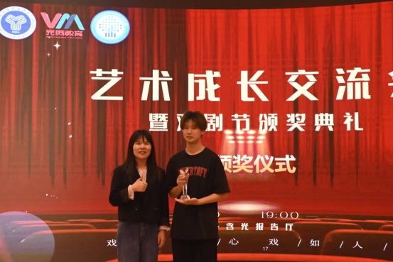 随着分享交流的深入,迎来了最激动人心环节——颁奖典礼。首先颁发的是数字经济与信息管理学院2024年名角杯戏剧节短剧竞演一等奖获得者《郭扶欢》剧组的全体成员,他们凭借出色的演技和精湛的艺术表现力,赢得了评委和观众的一致好评。其次颁发了优秀剧目奖获得者廖杨等同学、最佳导演奖获得者陈佳琳等同学和最佳演员奖获得者张云杰等同学。获奖者们的脸上洋溢着喜悦和自豪的笑容。