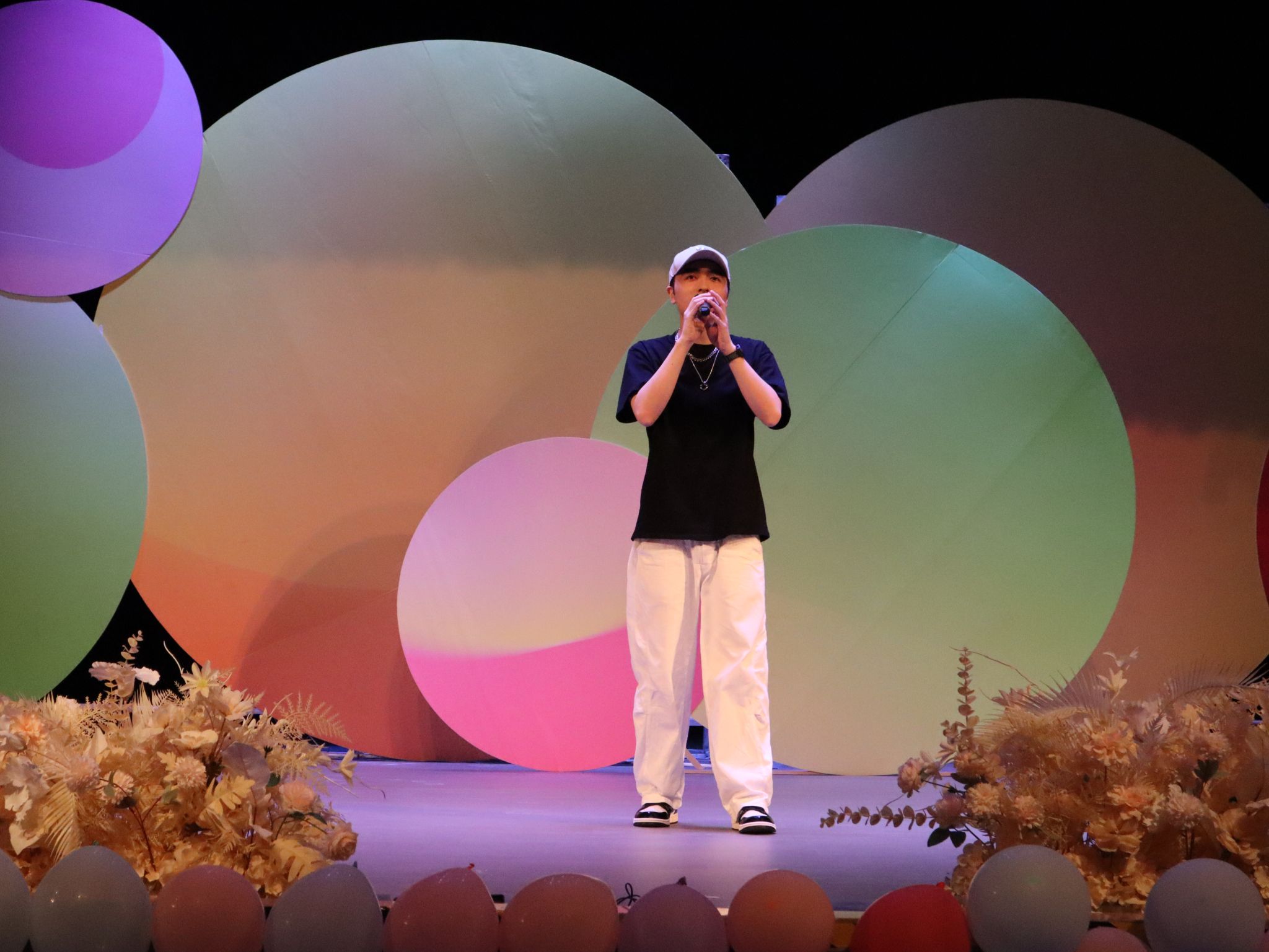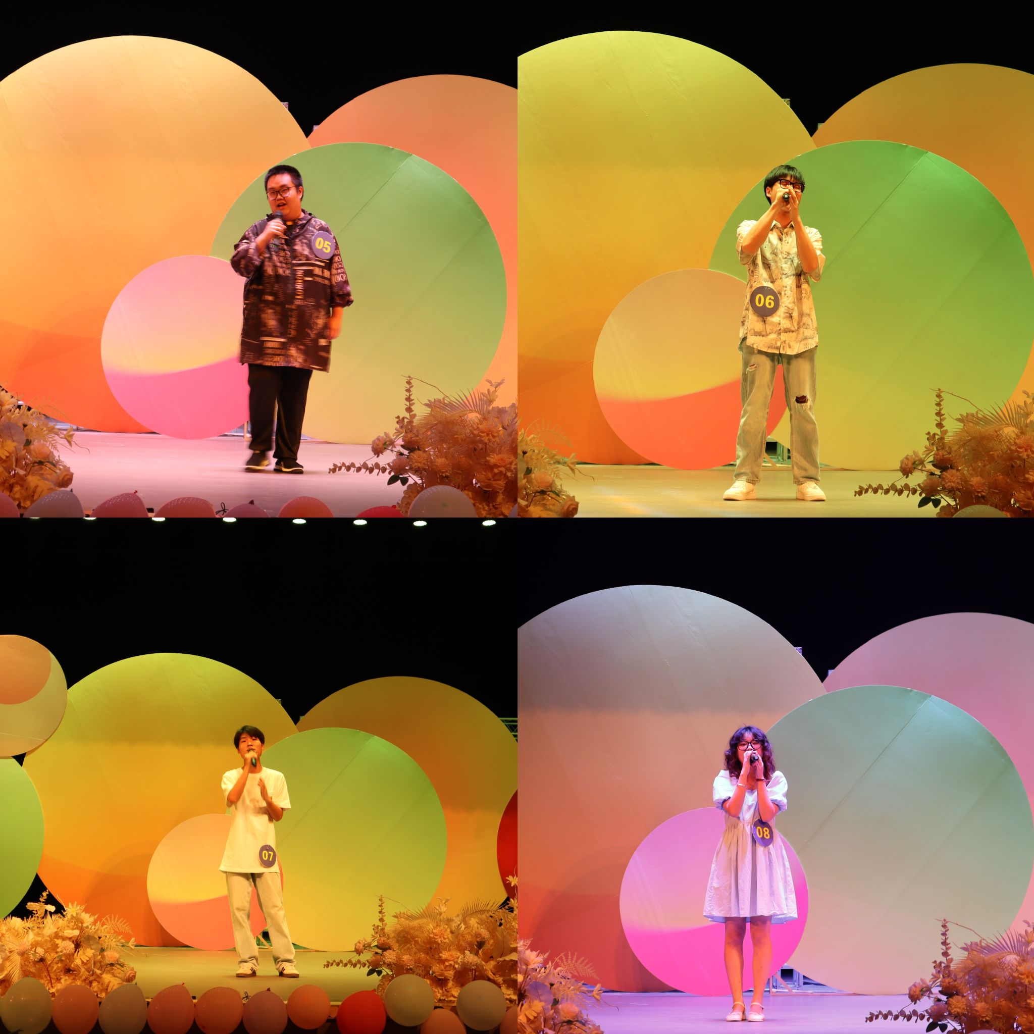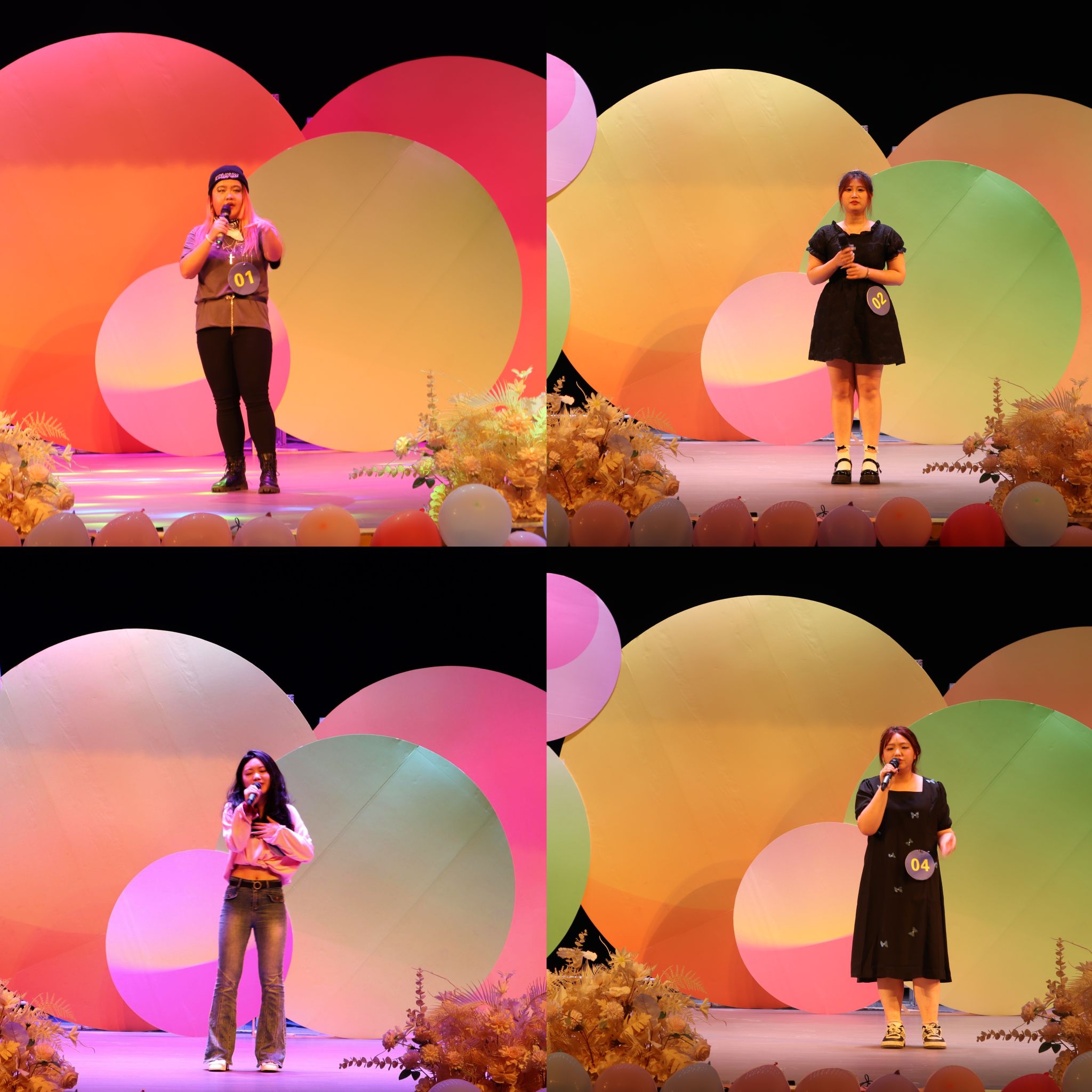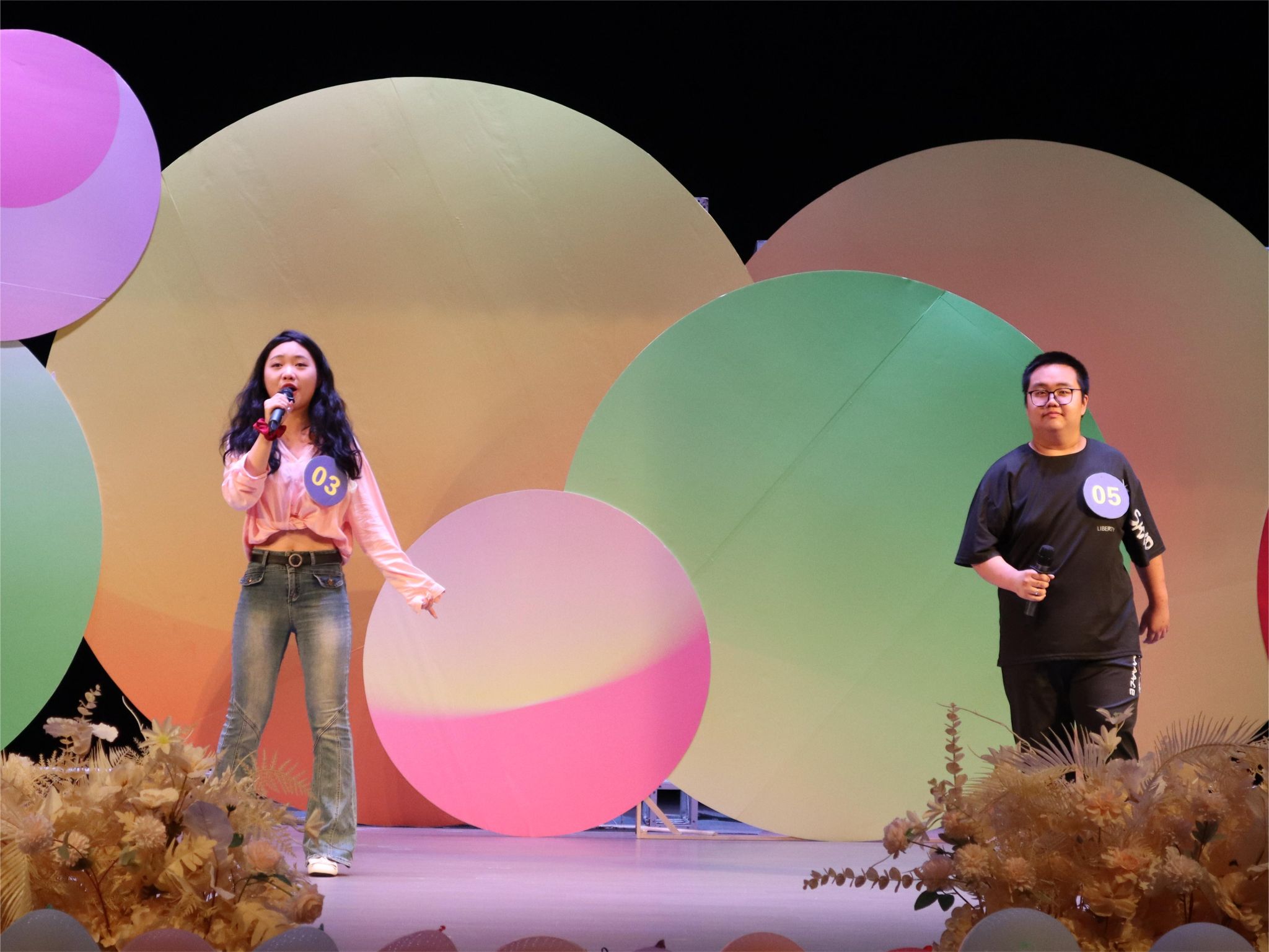 舞台上,每一束光都可以是故事的开端。随着活动现场的灯光缓缓聚焦于舞台中央,决赛正式拉开序幕。1号选手潘秋洁率先登台,为同学们带来一段振奋人心的英文rap,她以流利的语速和独特的韵律掌控全场,让人仿佛置身于国际音乐节现场;一曲《Love Yourself》细腻动人,2号选手张心红的声音如同春日里温暖的微风,轻拂过每个人的心田;向往浪漫与深情,《Nothing On You》因为你胜过一切;3号选手覃佳丽以其动听的歌声,将歌曲中的心动演绎出来,梦幻却又真实;4号选手吴昊深情献唱《Try》,她用歌声讲述出一个关于勇气与自我挑战的故事,触动听众们的心弦;