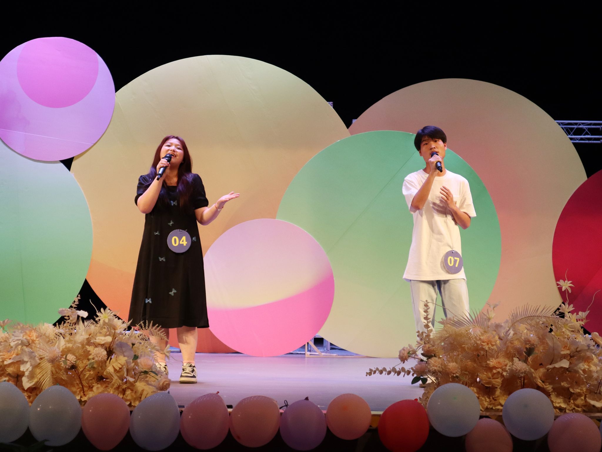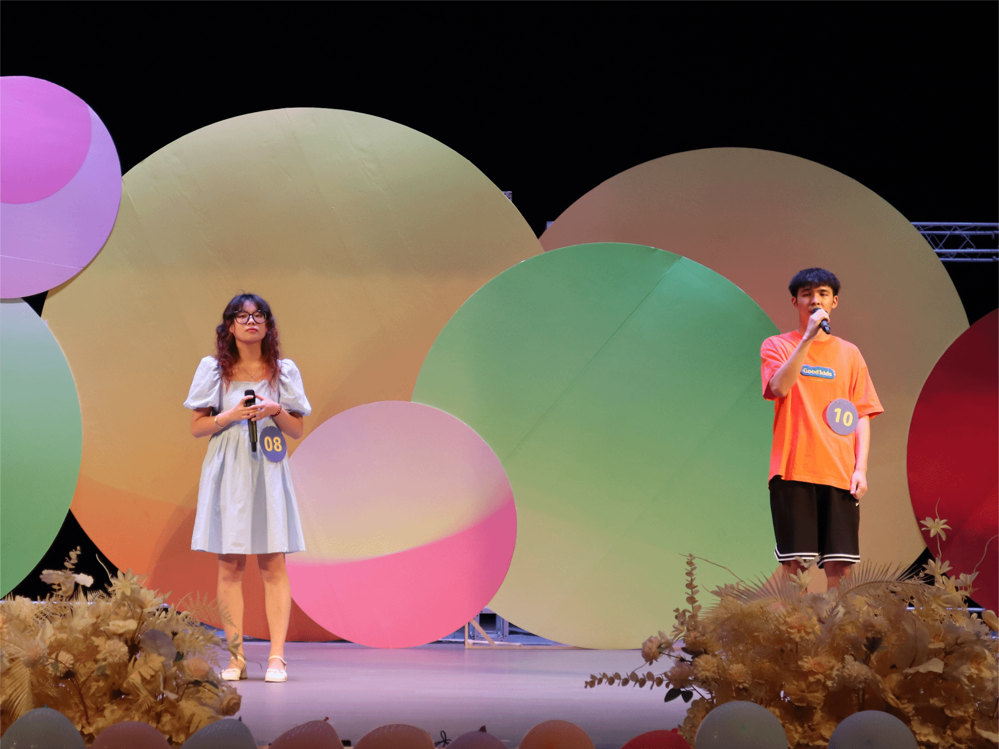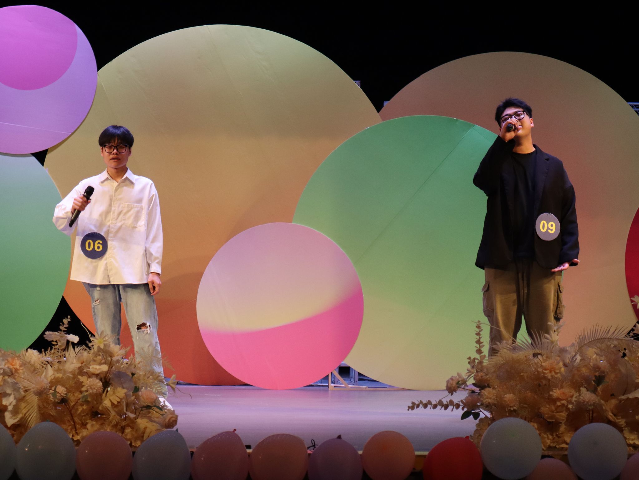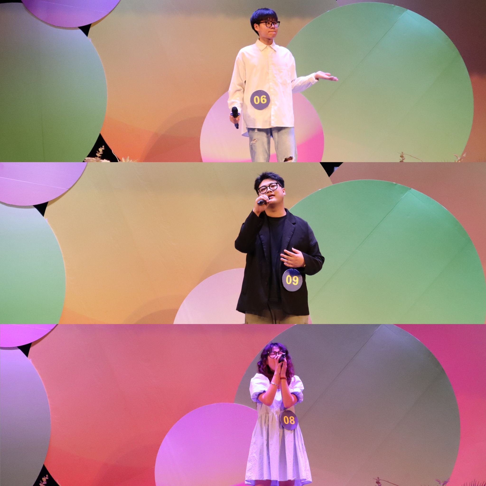 舞台上,每一束光都可以是故事的开端。随着活动现场的灯光缓缓聚焦于舞台中央,决赛正式拉开序幕。1号选手潘秋洁率先登台,为同学们带来一段振奋人心的英文rap,她以流利的语速和独特的韵律掌控全场,让人仿佛置身于国际音乐节现场;一曲《Love Yourself》细腻动人,2号选手张心红的声音如同春日里温暖的微风,轻拂过每个人的心田;向往浪漫与深情,《Nothing On You》因为你胜过一切;3号选手覃佳丽以其动听的歌声,将歌曲中的心动演绎出来,梦幻却又真实;4号选手吴昊深情献唱《Try》,她用歌声讲述出一个关于勇气与自我挑战的故事,触动听众们的心弦;