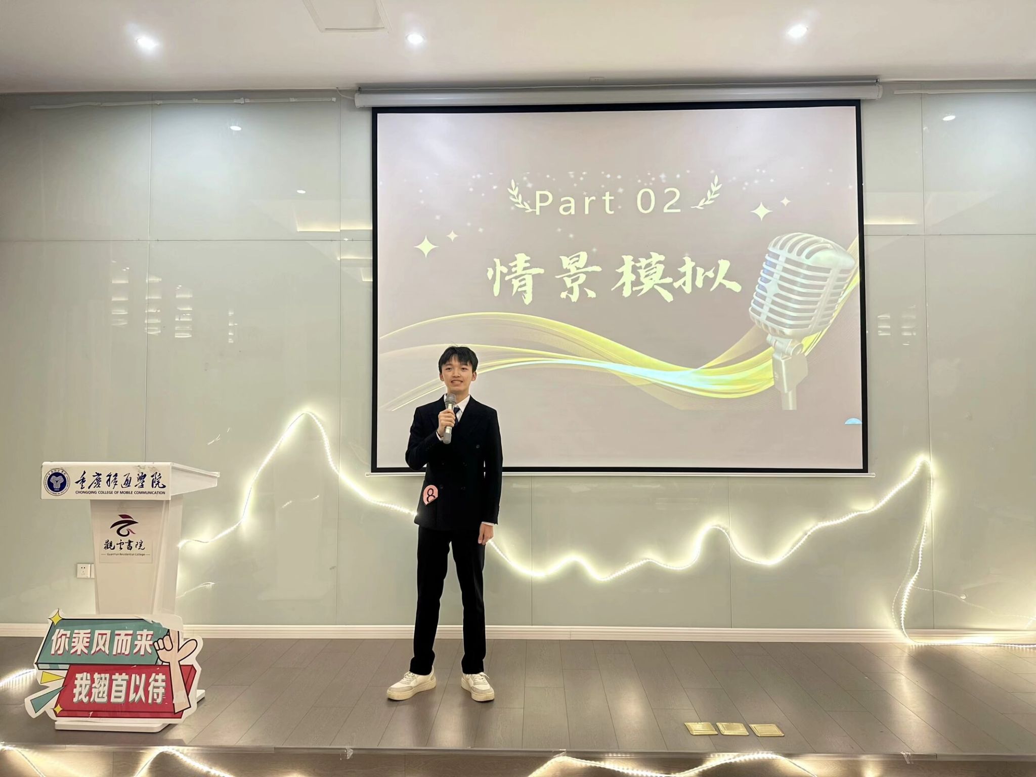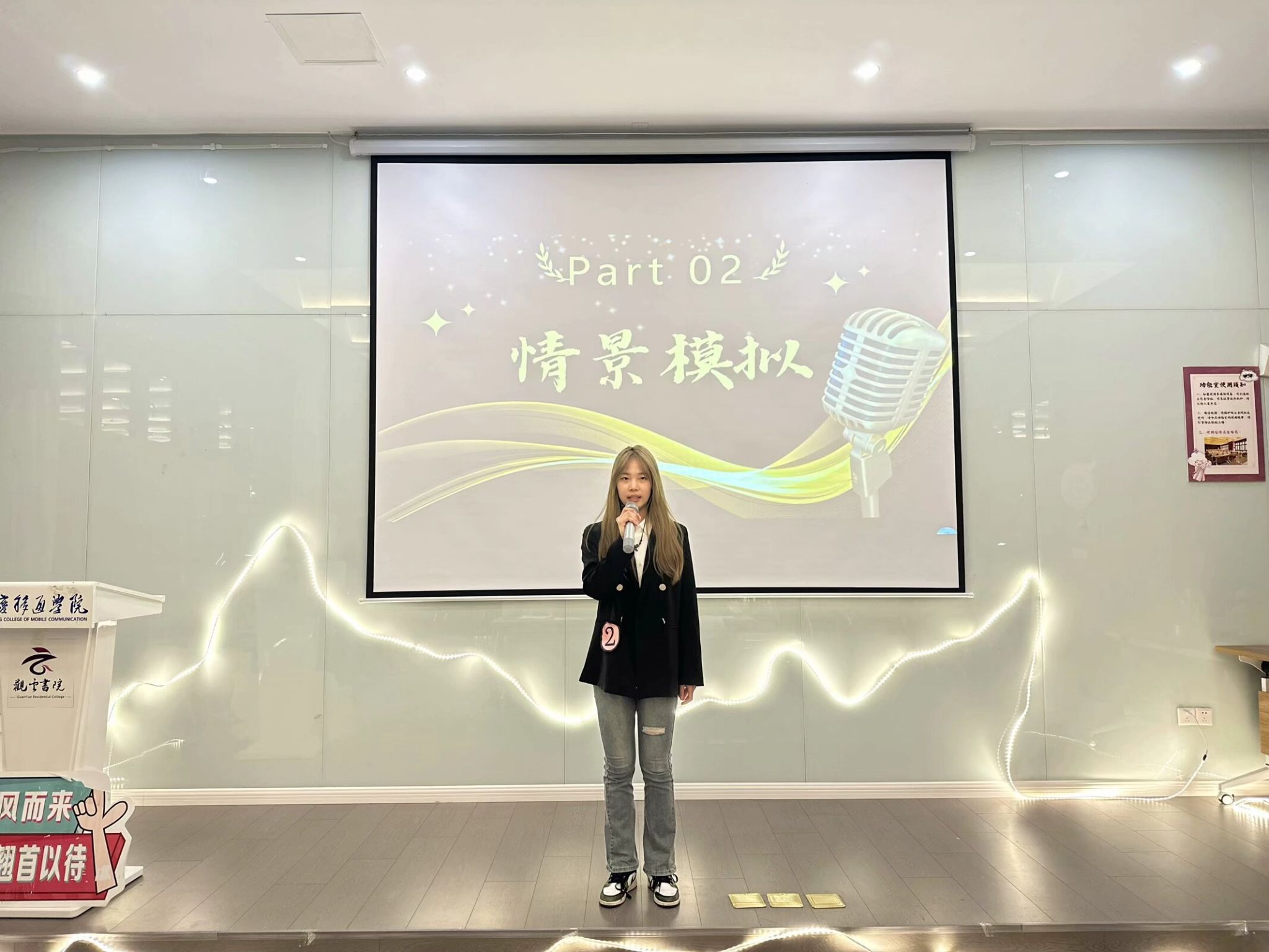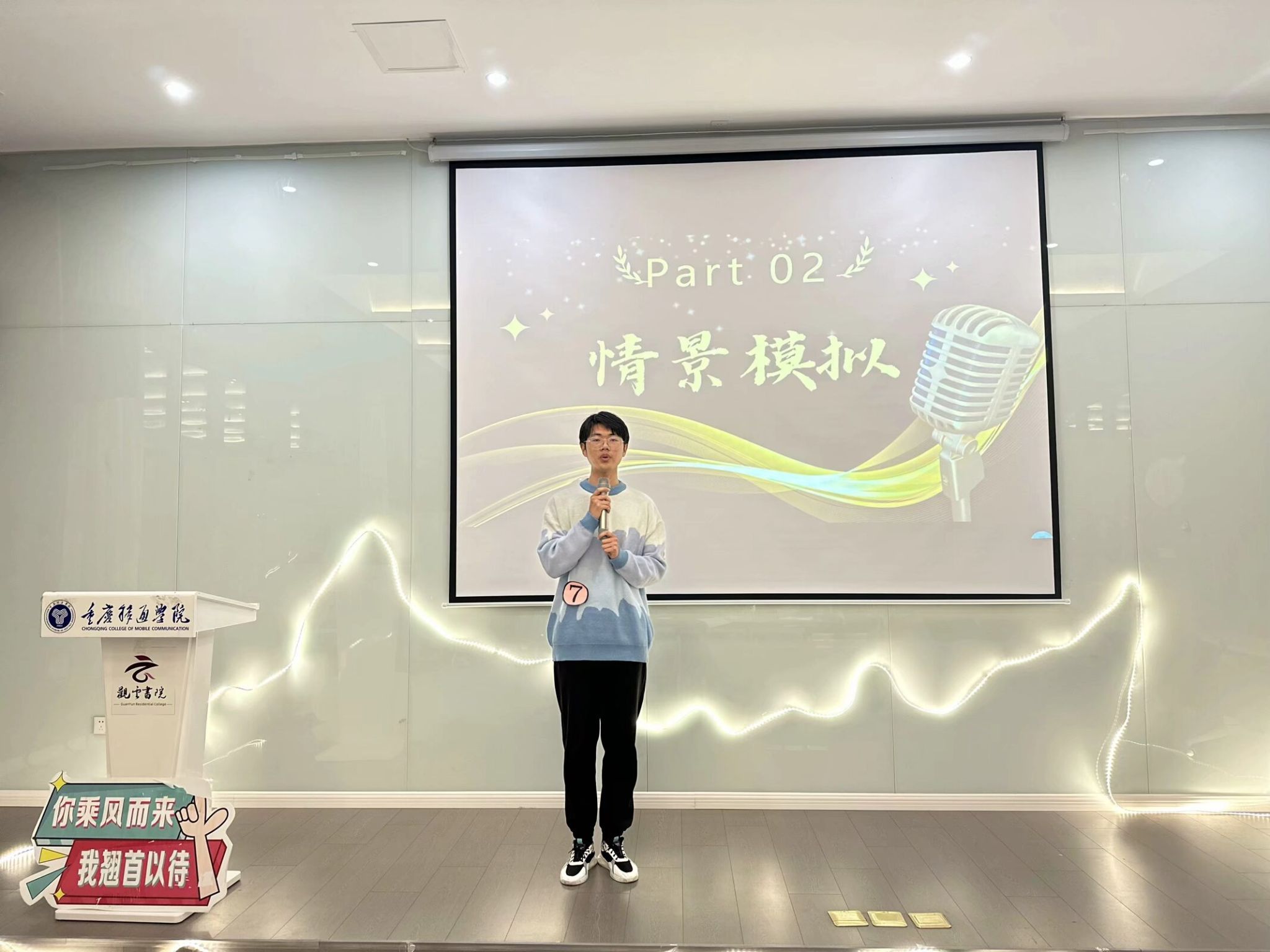 选手们的精彩措辞和悠扬语调清晰而富有感染力,给大家提供了身临主持现场般的绝佳观赛体验。参赛选手们使出浑身解数,沉着应对,妙语连珠,表现出很强的临场应变能力,获得评委和观众的热烈掌声。邓立伟同学脱颖而出,他字正腔圆,行云流水般的自我介绍,让我们耳目一新,他如同脱口秀一般的主持,让现场紧张气氛变得欢快起来,充分展现出他的控场能力。