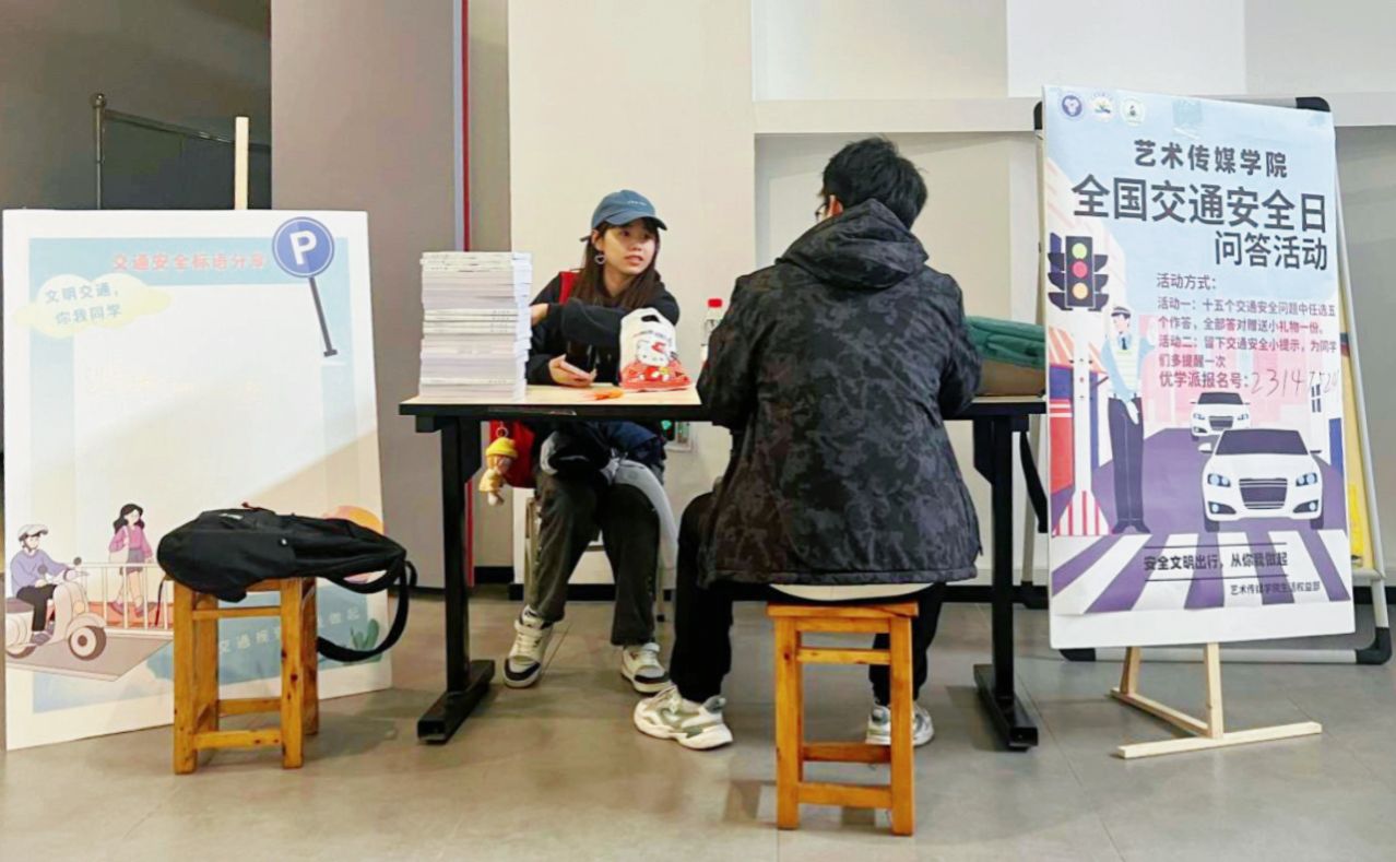 艺术传媒学院生活权益部为这次活动准备了多种宣传类型,通过悠学派线上活动发布和线下现场宣传,深入为同学们普及“全国交通日”以及交通安全知识等。活动伊始,艺传学子被展板所吸引,在工作人员的指导下积极踊跃排队参与到本次交通安全知识问答活动当中,氛围活跃且秩序井然,展现了艺传学子们良好的精神风貌。