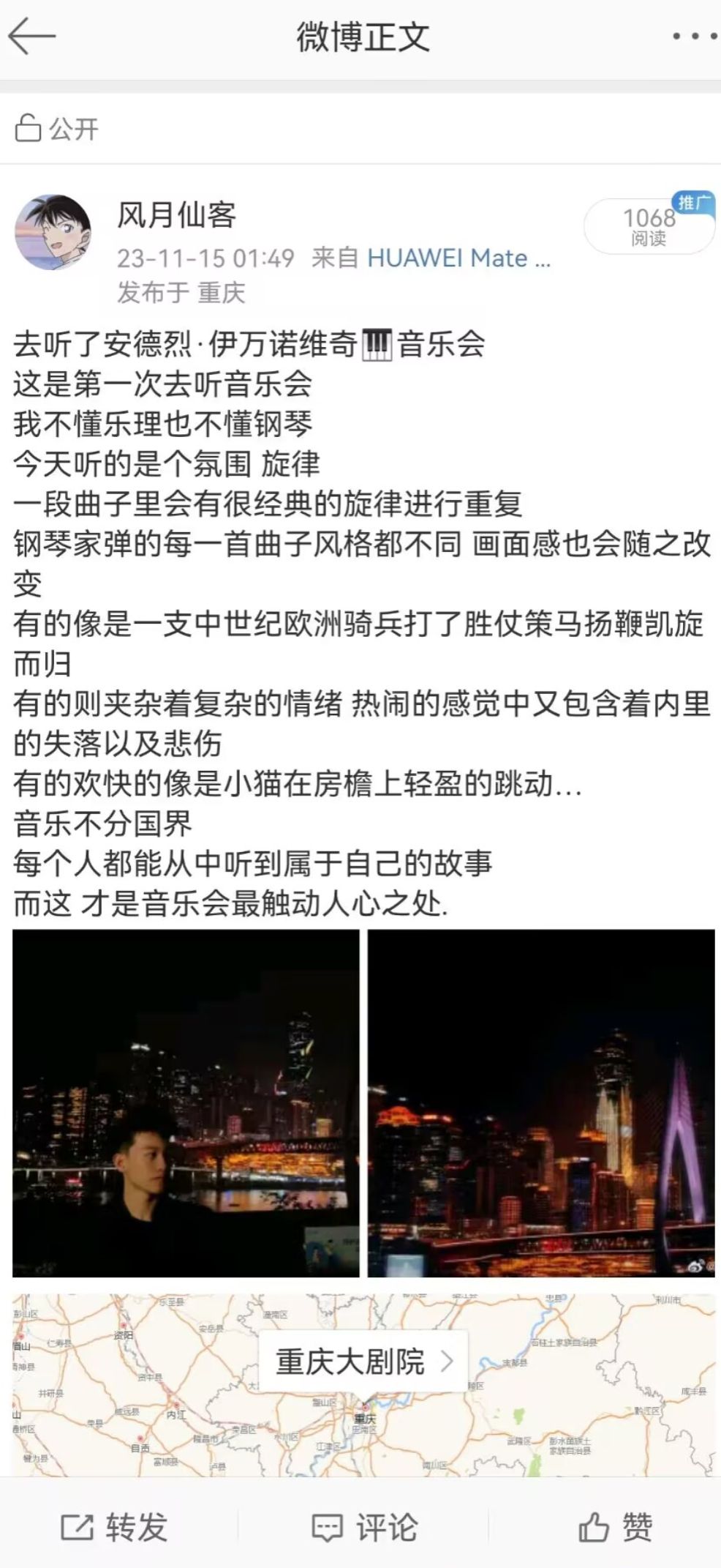 为了培养学生对古典音乐的学习兴趣,提升音乐通识课程教学体验,2023年11月14日,陈榭非、路梦遥两位老师带领来自远景学院各年级三十多名学生前往重庆大剧院欣赏由俄罗斯著名钢琴演奏家安德烈·伊万诺维奇带来的钢琴独奏音乐会。这位享誉世界的钢琴大师以他无与伦比的音乐艺术,令参与此次活动的各位同学陶醉其中。