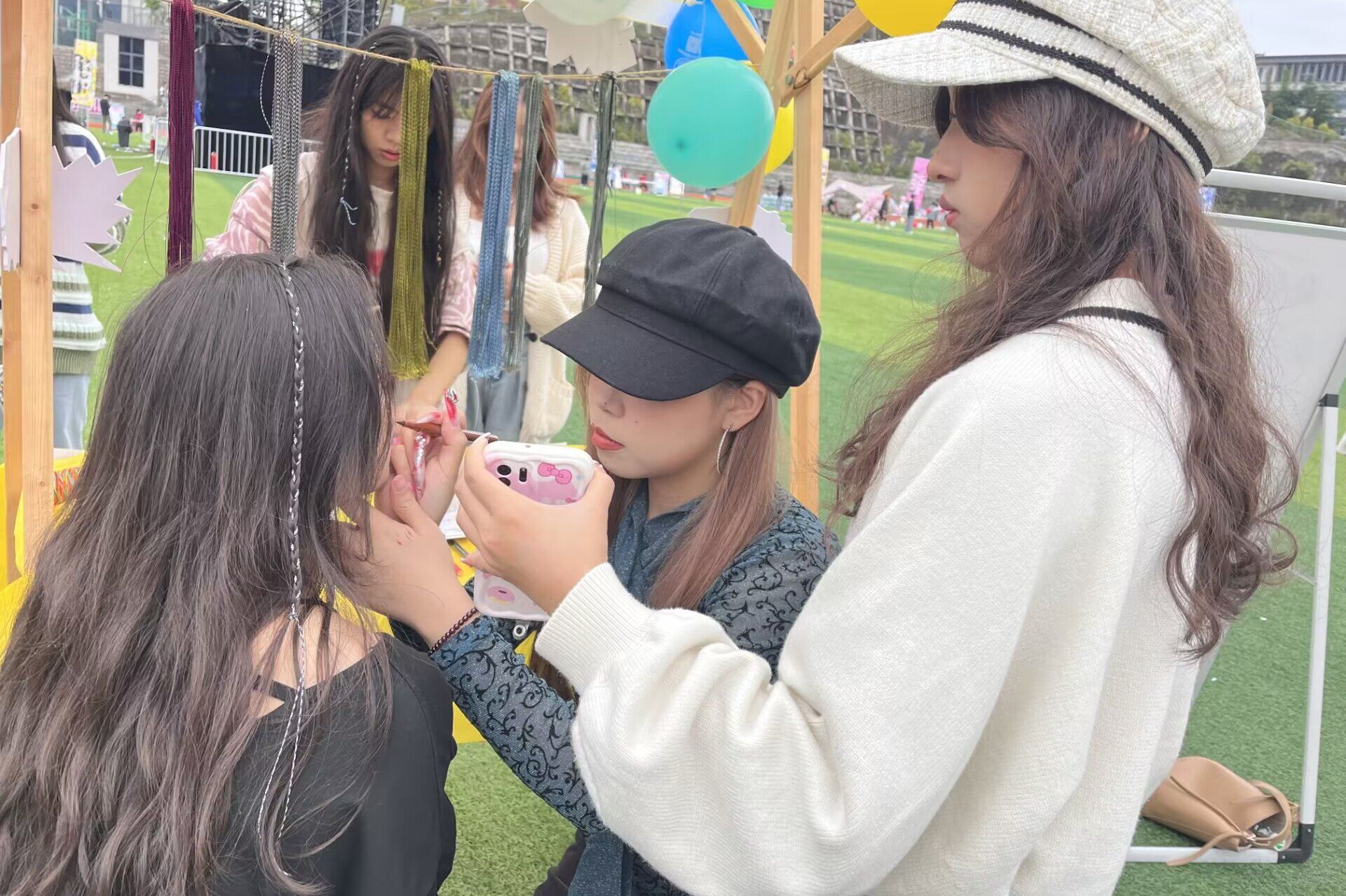 创意妆容改造 “创意妆容改造”音乐节外围活动的第一个板块,妆造富有创新与想象力,一起来diy创意妆容,让参加的同学们体会到妆容的个性与乐趣,吸引了许多喜欢化妆的同学们兴趣,排着长龙般队伍,有序等待工作人员化妆。化妆的工作人员与同学们一起交流探讨,发展爱好。工作人员根据同学们的需求和喜好进行妆造,眼影的色彩吸引眼球,各具特色。
