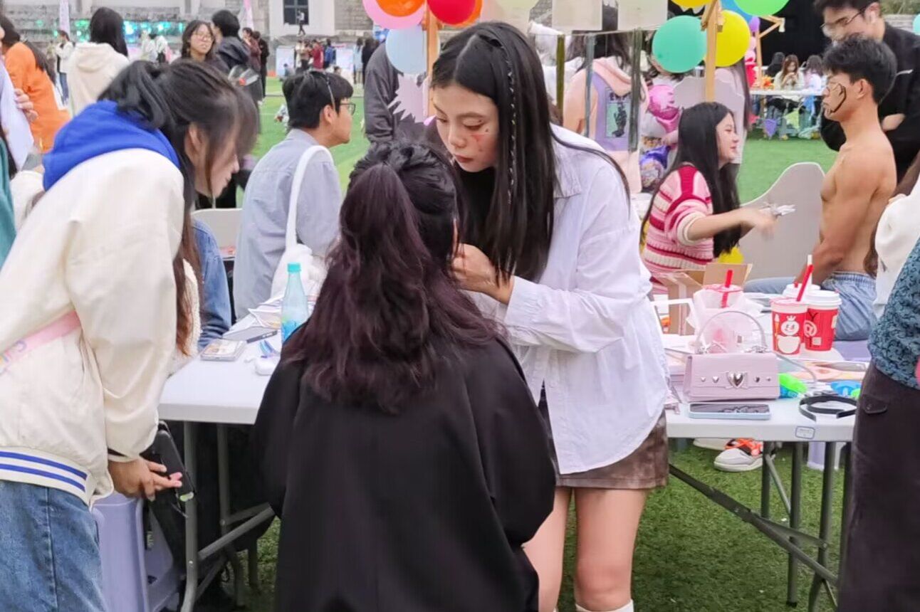 艺术部联合colorful彩妆协会为同学们编彩辫,充分发挥了大家的想象力和创造力。在这里,同学们可以随意挑选不同颜色的彩绳,让部门成员们为她们设计不同样式的辫子。这形成了一道靓丽的风景线,彰显了同学们的青春特色,让同学们亲身体验到这次活动中。
