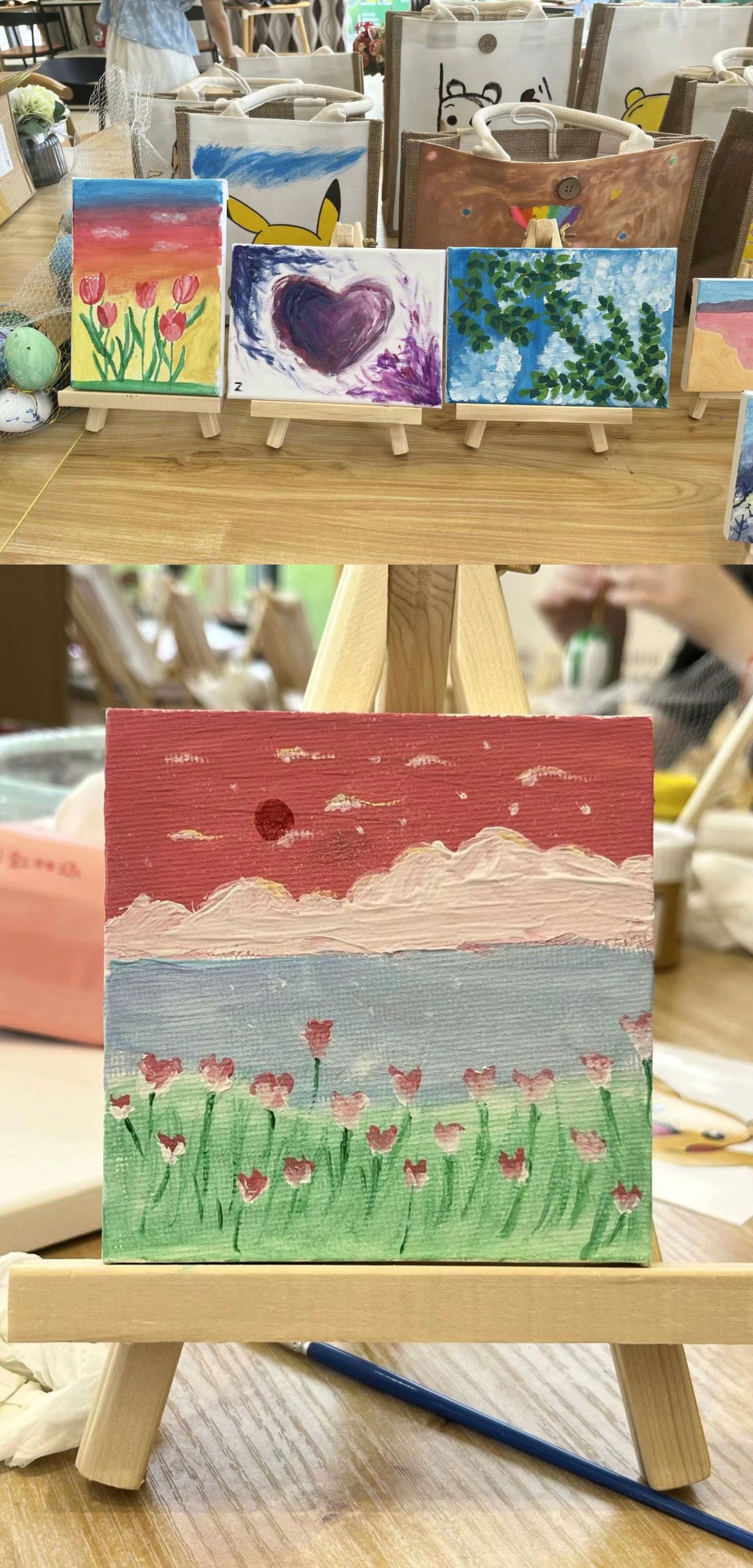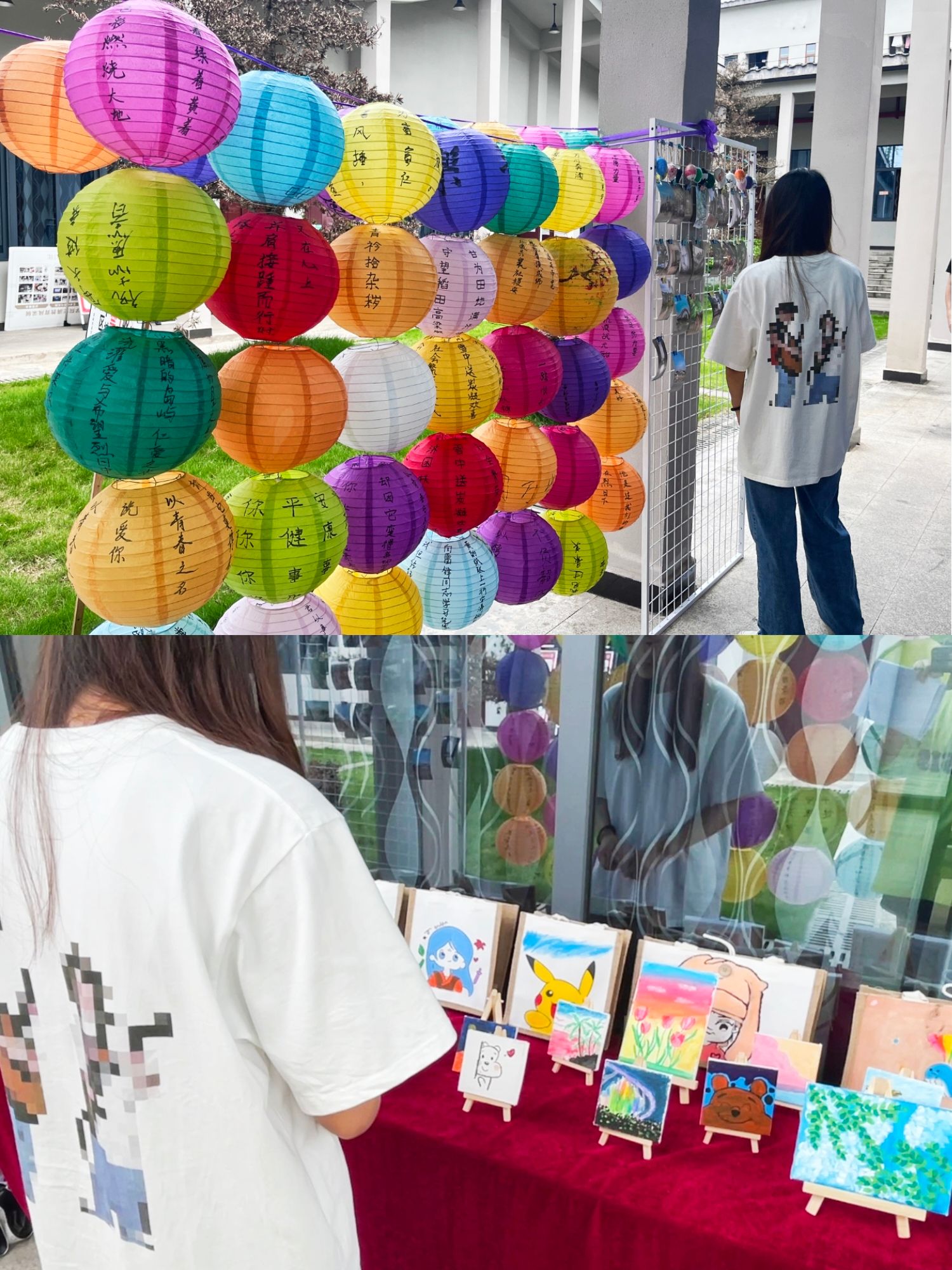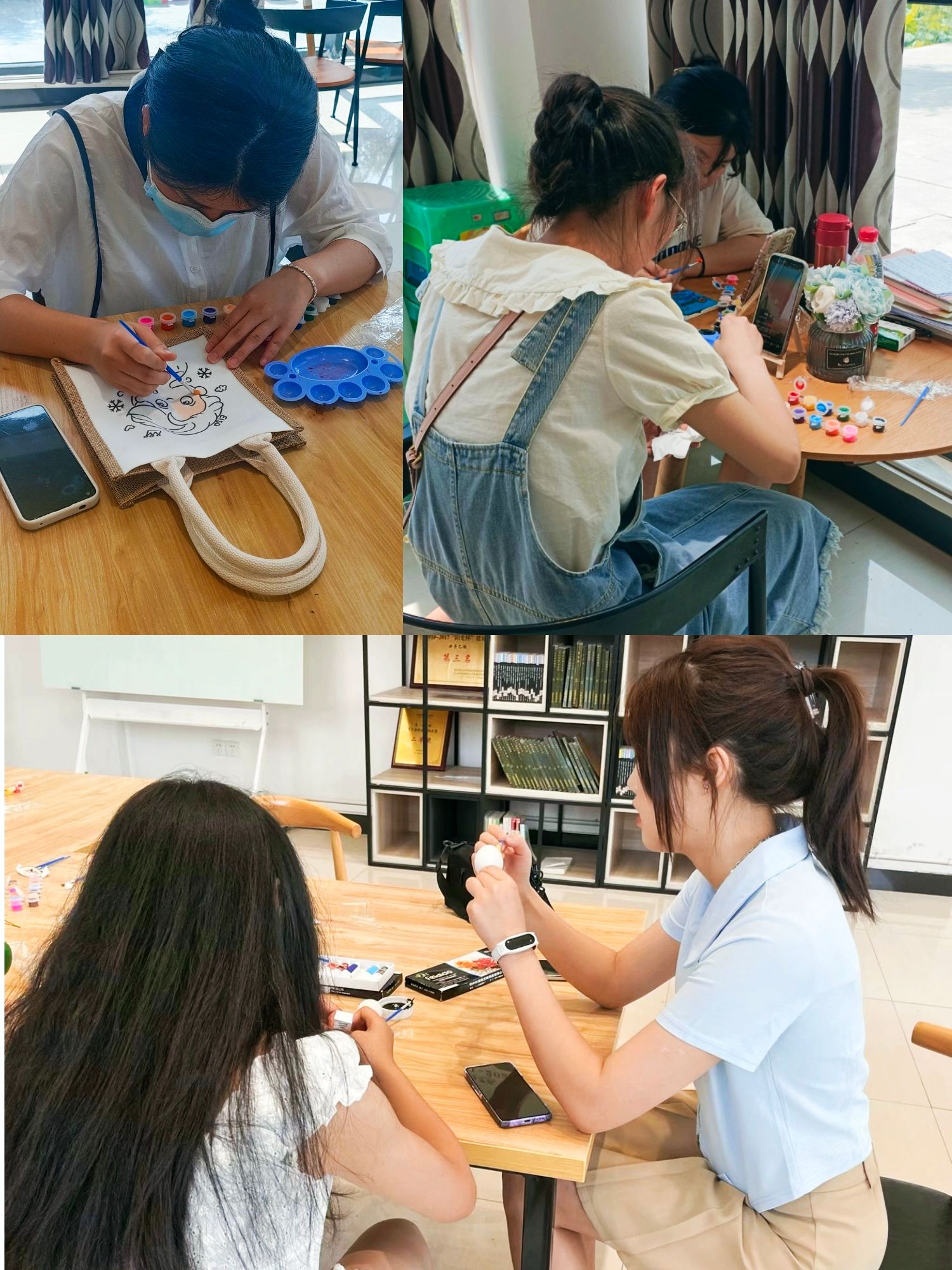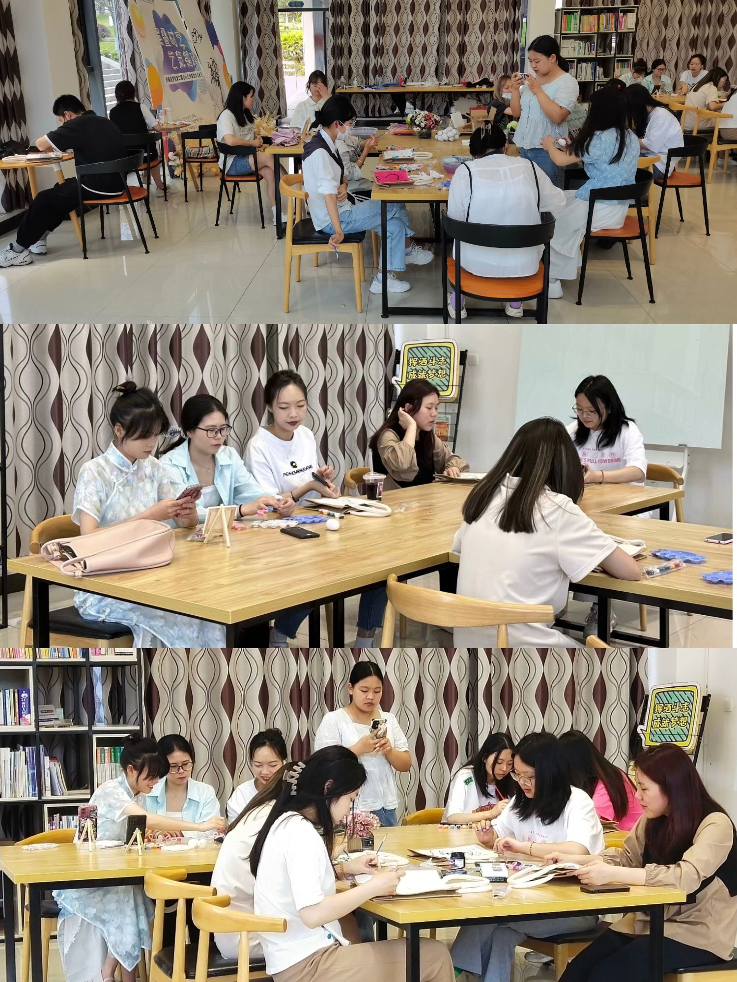 一支画笔,一块画布,会碰撞出什么灿烂的火花呢?同学们个个神情专注地拿着手中的画笔,描绘着自己的帆布袋或者画布,还不时和身边的伙伴交流心得。经过同学们认真的创作,一个个色彩丰富、创意十足的画作在手中呈现,这些注入了自己想法的作品,将成为他们在大学校园中最独特的回忆。