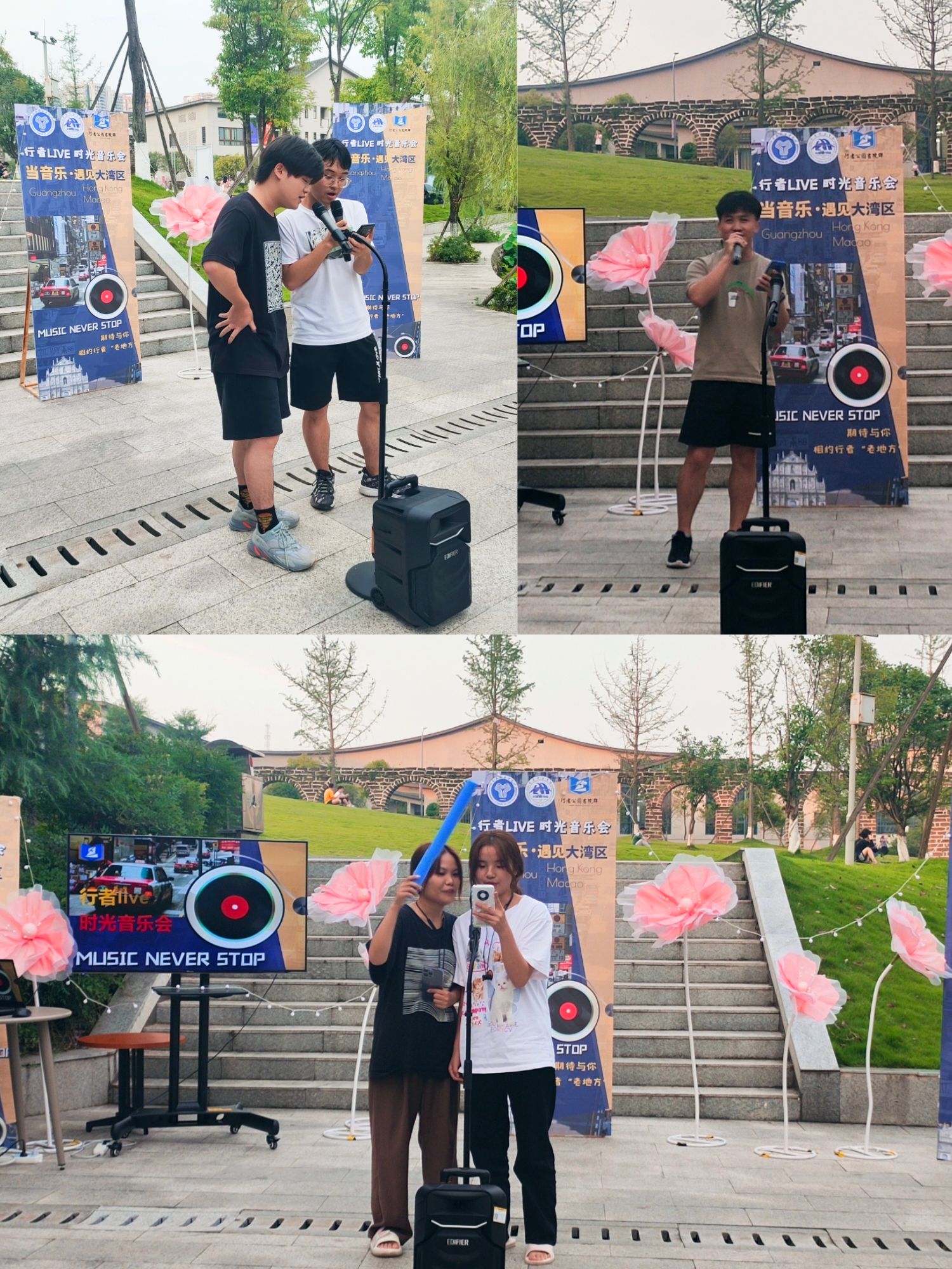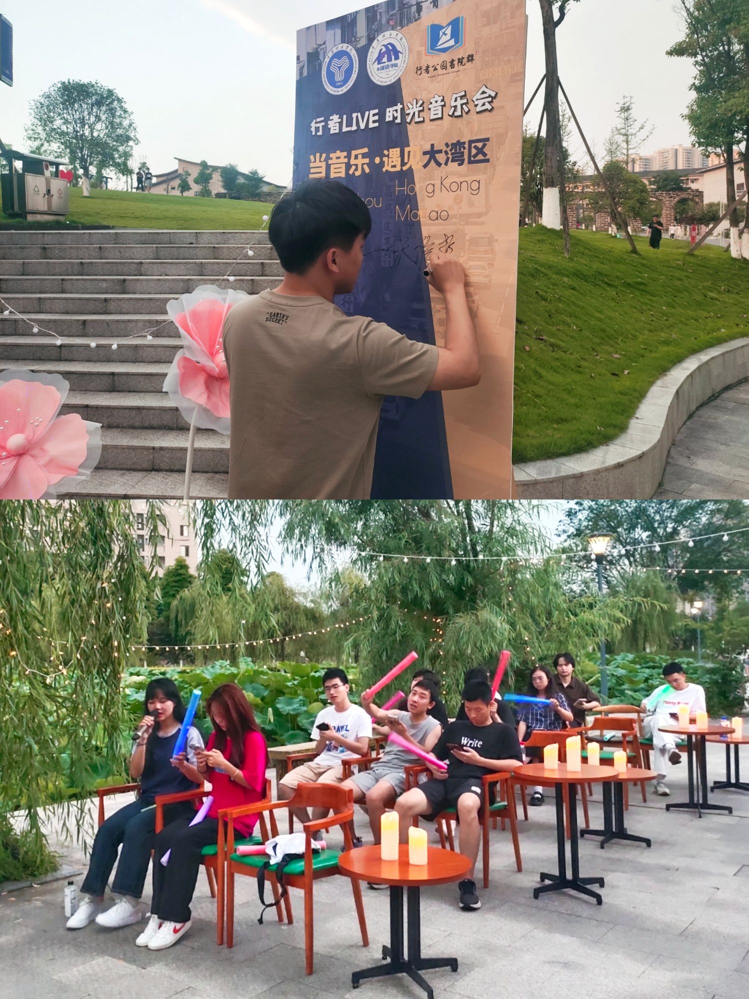 音乐悠扬,喜悦共赏。2023年6月7日,荷悦书院池塘边,外国语学院第二届“层叠时空 艺览循臻”——“全民艺术家”艺术文化月:全民艺术声乐体验暨行者LIVE·时光音乐会,由外国语学院WINK艺术团与行者公园书院群联合举办。