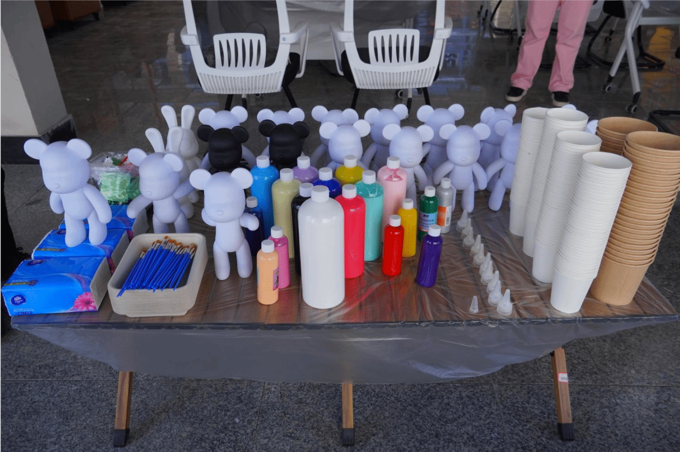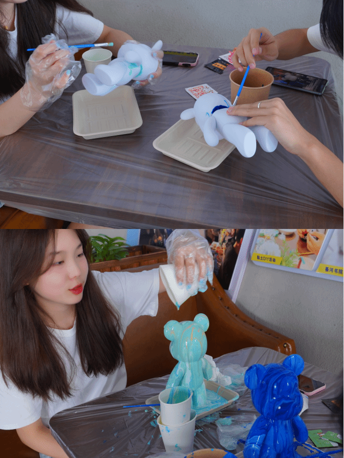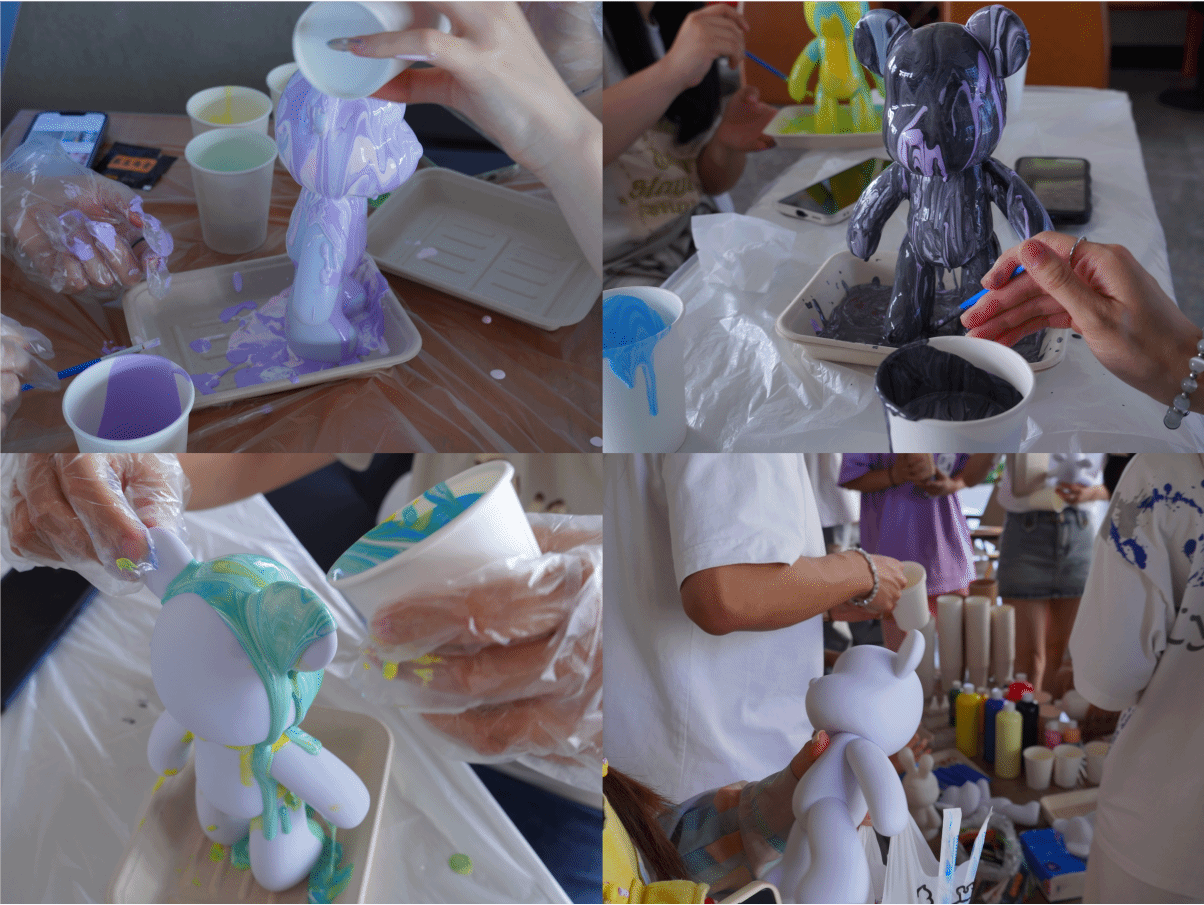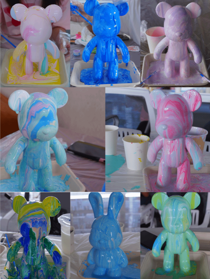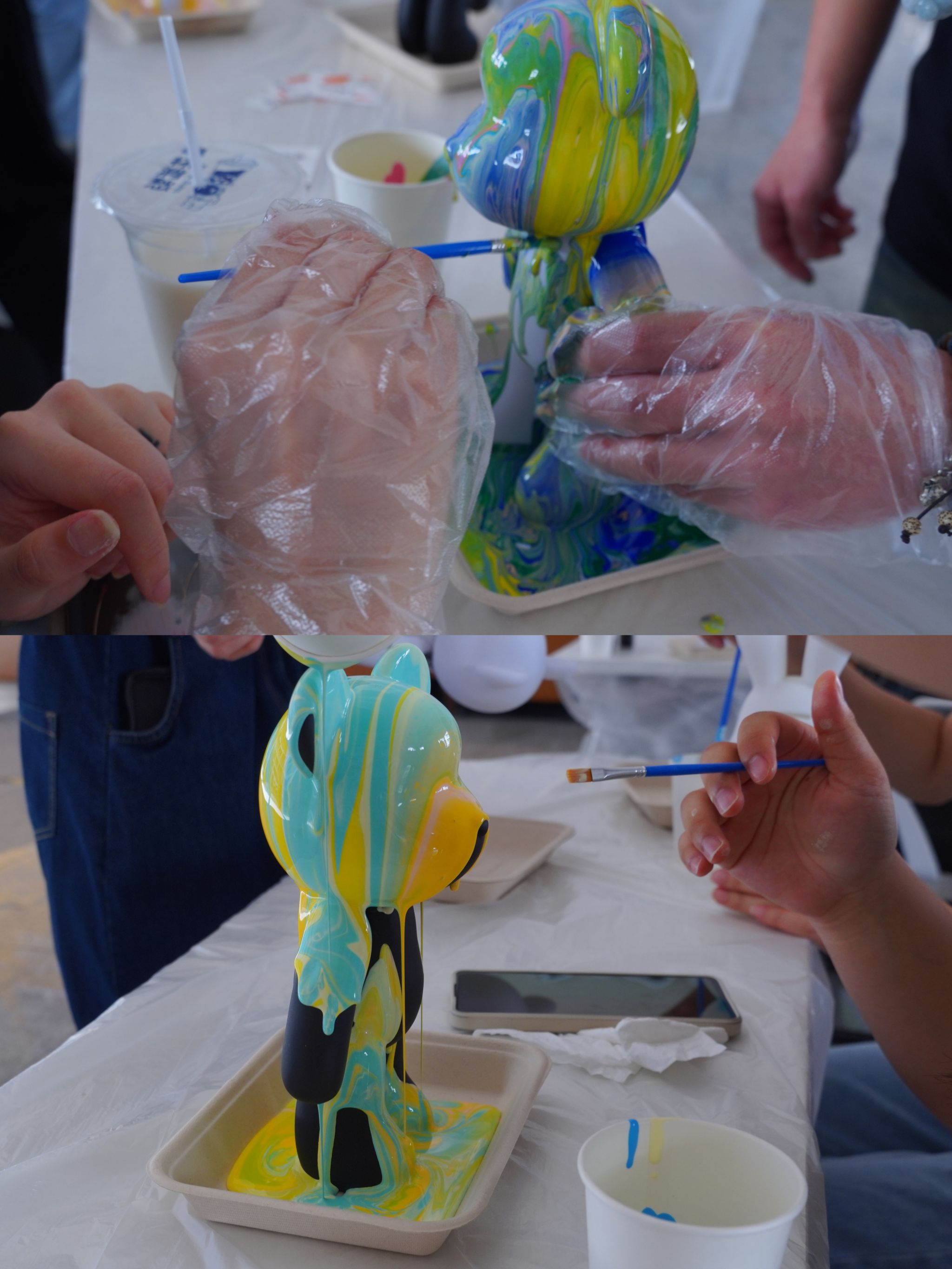 每个流体熊是不同色彩和创造力的碰撞,更是每个人不同个性的释放。同色系更清新,撞色系更潮酷,体验不一样的流体艺术,沉浸式制作的过程,治愈又解压,颜料倾泻而下,你永远不知道,下一秒会获得怎样的神秘暴力熊。液体颜料塑造的花纹,永不规则的流动线路。当颜料遇上流体熊,没有路径和方向,形成最自然的模样。在制作过程中,同学们互相交流、鼓励,不断尝试和创新,最终创作出自己满意的流体熊。这些流体熊不仅是同学们的作品,更是他们自己的心血和创意的结晶。最后,同学们用塑料杯将流体熊封存晾干,等待静默的时光与和煦的春风将色彩定格,成为记忆中永恒的亮点。