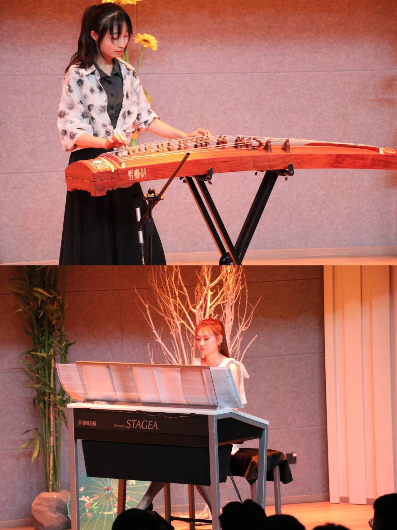 古筝,弹拨弦鸣乐器,又名汉筝、秦筝,是汉民族古老的民族乐器,流行于中国各地。古筝的音质穿透力很强,而校乐团民乐分团韩汶君,周玉婷两位同学,通过各自的专业能力、默契,将对民乐的激情表现的淋漓尽致,让观众们感受到了古筝的穿透力和魅力,欣赏到了古筝的美。