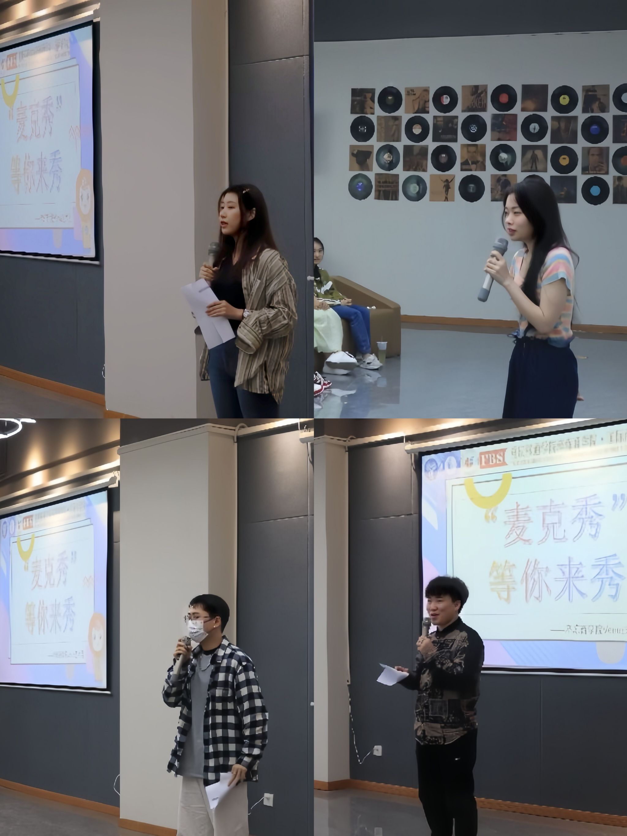 为了全面推进完满教育,促进移通学子德智体美全面发展,展现学校艺术教育成果,提升学生的艺术修养和综合能力。淬炼·国际商学院Venus艺术团于4月12日下午2点在合川校区南湖书院声影活动室举办了首届“麦克秀”大赛。淬炼·国际商学院宣传板块指导老师张思静、艺术修养与实践板块指导老师杨子莹、以及黄家杰、涂元两位学长出席比赛并担任评委。
