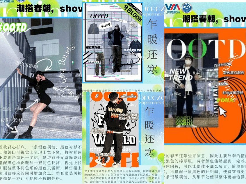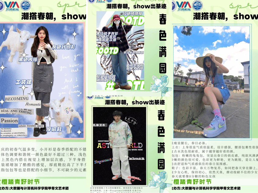 春山春水、春风春雨、春草春花、春日春泥、春夜春心、春社春耕……为了与春有一个浪漫的约会,同时让同学们提升自我,展示自我,用服装搭配展示春日朝气与时尚魅力,彰显个性,丰富校园生活。大数据与计算机科学学院甲骨文艺术团于2023年3月21日到3月24日举办了为期三天的线上收集、线下展出的“潮搭春朝,show出綦迹”的今日穿搭活动。