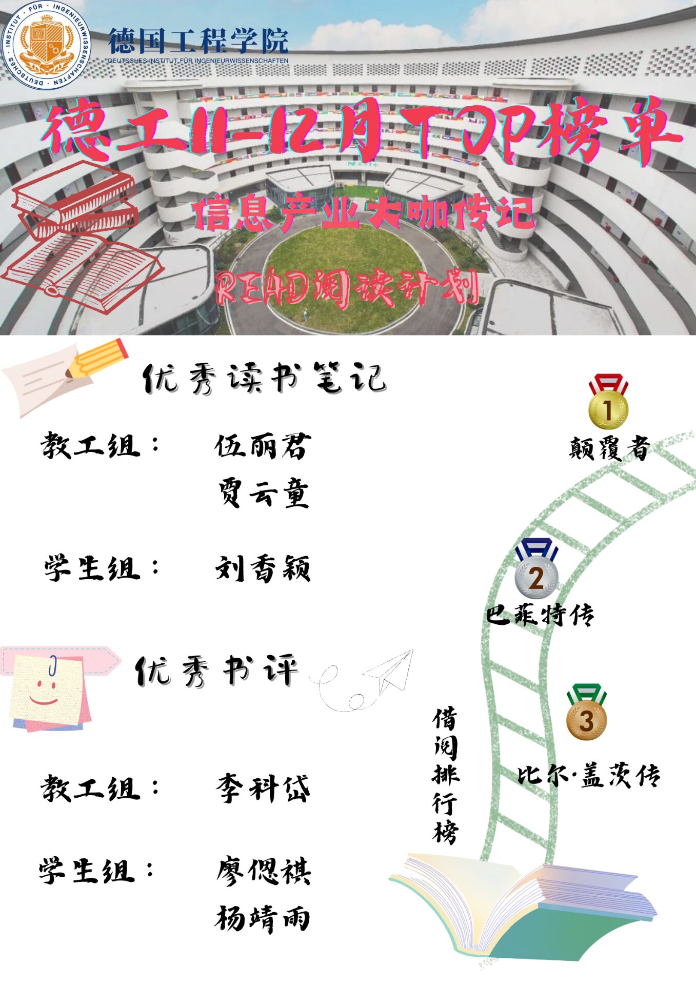 随着德国工程学院信息产业大咖传记阅读计划系列活动的不断深入推广,充分利用校内丰富的阅读资源,感受知识的交叉融合,让阅读成为习惯,陪伴师生成长、成才。