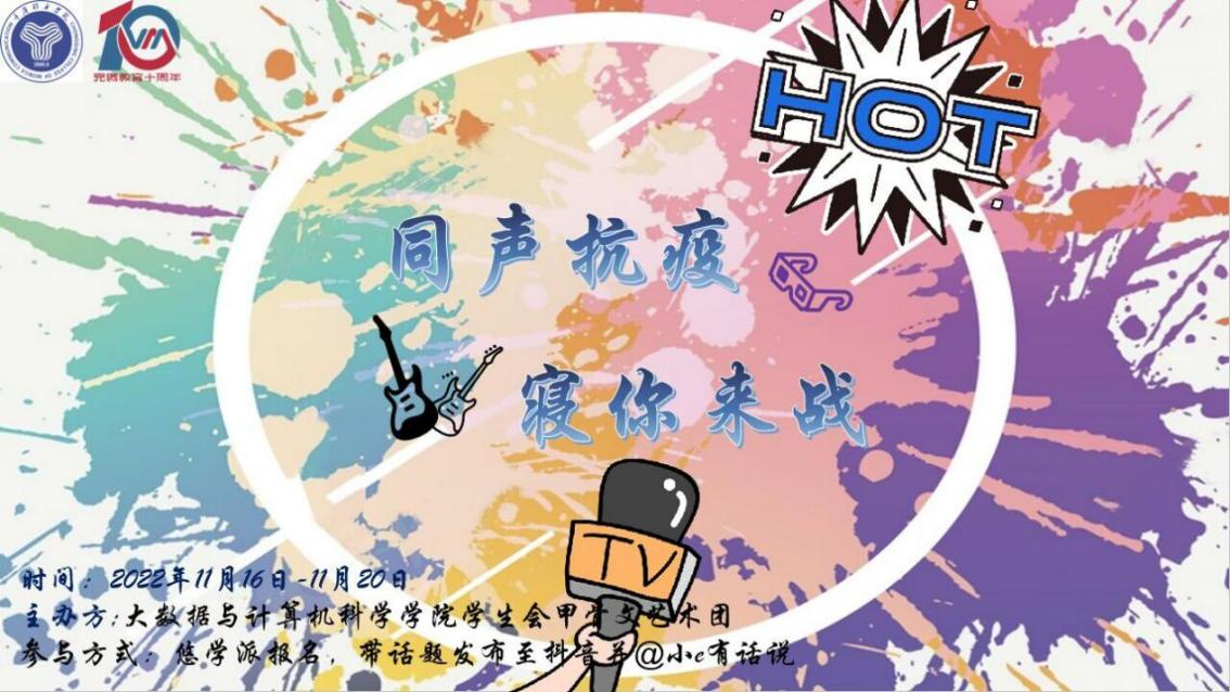 口罩不离身,病毒难近身。口罩随身带,疫情走的快。突如其来的疫情,让学校封校封寝,但是封不住同学们的心。在疫情封闭管理期间,大数据与计算机科学学院学生会甲骨文艺术团举办了线上“同声抗疫,寝你来战”趣味接唱比赛(双校区),鼓励大家用接唱的形式来表达自己对于志愿者教师们的感激之情,以特别的方式参加到抗击疫情中来,真情歌颂和感谢身边的志愿者、医务人员、学校工作人员等,这一群默默付出、坚守一线的抗疫英雄们。