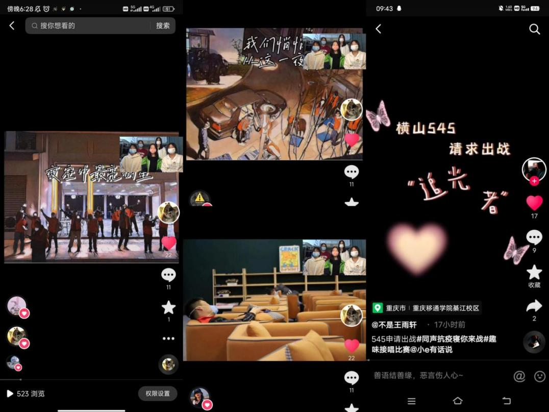 每个寝室都有自己独特的风格,从选曲到剪辑,倾注了同学们的心血,每一首精挑细选的音乐,都是同学们发自内心的情绪、歌颂、感激。《我相信》唱出同学们对未来的憧憬,对抗疫成功的坚信;一首《改变自己》形象的展现了同学们的寝室生活,铿锵有力的歌曲让同学们感受到了抗击疫情的决心;《我的未来式》大受好评,因为梦想不灭,也因年少的骄傲轻狂!