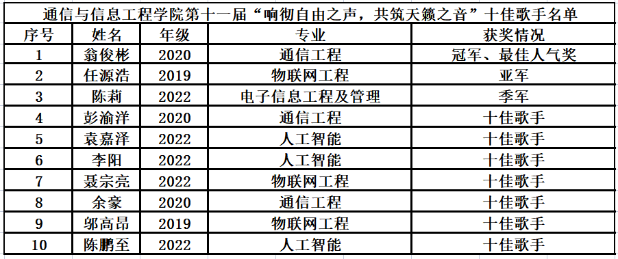 在心里种花,人生才不会荒芜。至此,通信与信息工程学院第十一届“响彻自由之声,共筑天籁之音”十佳歌手决赛已落下帷幕,但我们的青春和道路并不会就此落幕,通信学子将以更加饱满的初心,更加诚挚的热爱,去追寻艺术,去享受生活,生生不息。