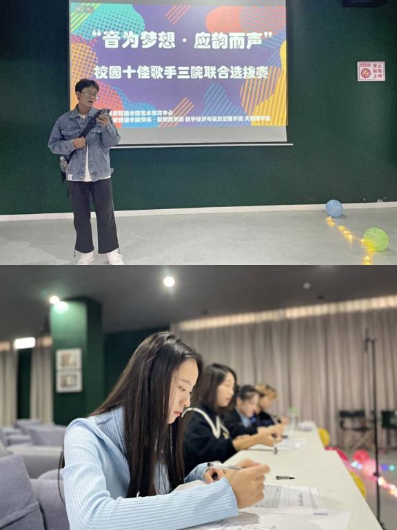 歌声从这里传出,音符从这里飘扬,青春从这里飘荡,梦想从这里启航!为响应当代青年大学生追求音乐梦想、活跃生活气氛,繁荣校园文化,丰富三院学生课余文化生活,努力营造积极向上、健康文明的校园文化氛围,特此面向重庆移通学院(綦江校区)2021级淬炼·国际商学院、2022级数字经济与信息管理学院、2022级大健康管理学院三个学院的全体学生举行“音为梦想·应韵而声”校园十佳歌手大赛三院联合选拔赛。