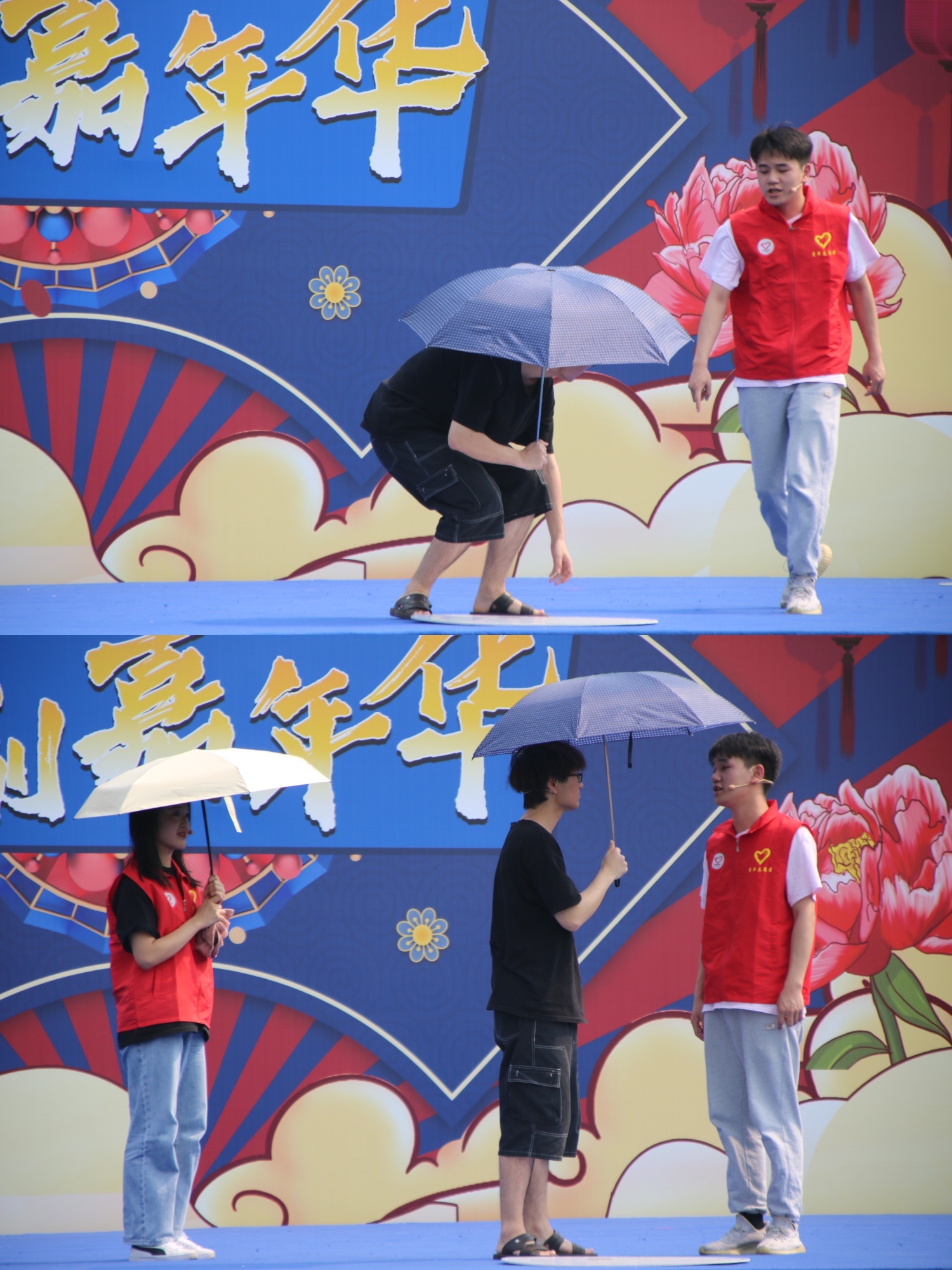 排练的过程如同白马过隙,眨眼来到汇演的日子。4月23日D区五人制足球场上晴空当头,但这并没有阻挡学子们对艺术的追求与渴望。现场氛围随气温持续上升,伴随着上一个节目的结束,《守望相助》小剧场拉开了帷幕。