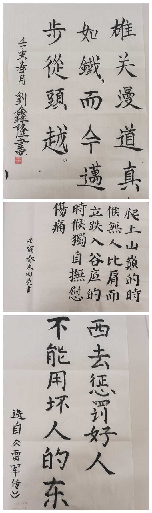 书法不仅能给人以美的享受,还能陶冶情操。书法是一种高雅的艺术,能使人在挥毫中自得其乐。在比赛中荣获一等奖的刘鑫隆同学表示:“现在的生活节奏越来越快,持之以恒地练习书法,可以改掉性情浮躁、做事马虎、缺少耐心的缺点,达到磨炼意志、规范行为、培养人格的目的。正所谓既学书法,又学做人。”陈伟同学也赞同道:“学习书法有利于陶冶情操,这次书法活动配上大咖们的优秀语录,能更好地提高同学们的想象力、辩证思维能力和艺术审美品位。”