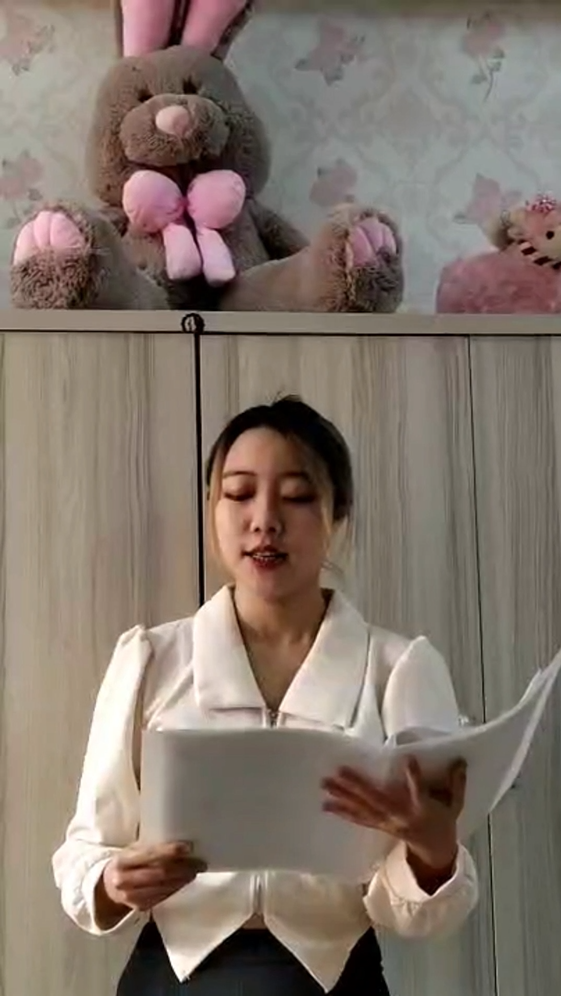 紧接着又是普通话考验和趣味绕口令,两位选手在这两轮中充分展示了各自的基本功。在最后一项妙语连珠中,两位选手思维敏捷,天马行空,各自都发挥充分且合理的想象,把随机提供的几个词语联系起来,组成一个个很有意境的小故事。由于疫情原因还有一位参赛选手刘恩妮同学不能来到现场参加比赛,两位评委老师将通过刘恩妮同学上传的决赛视频作品进行打分。