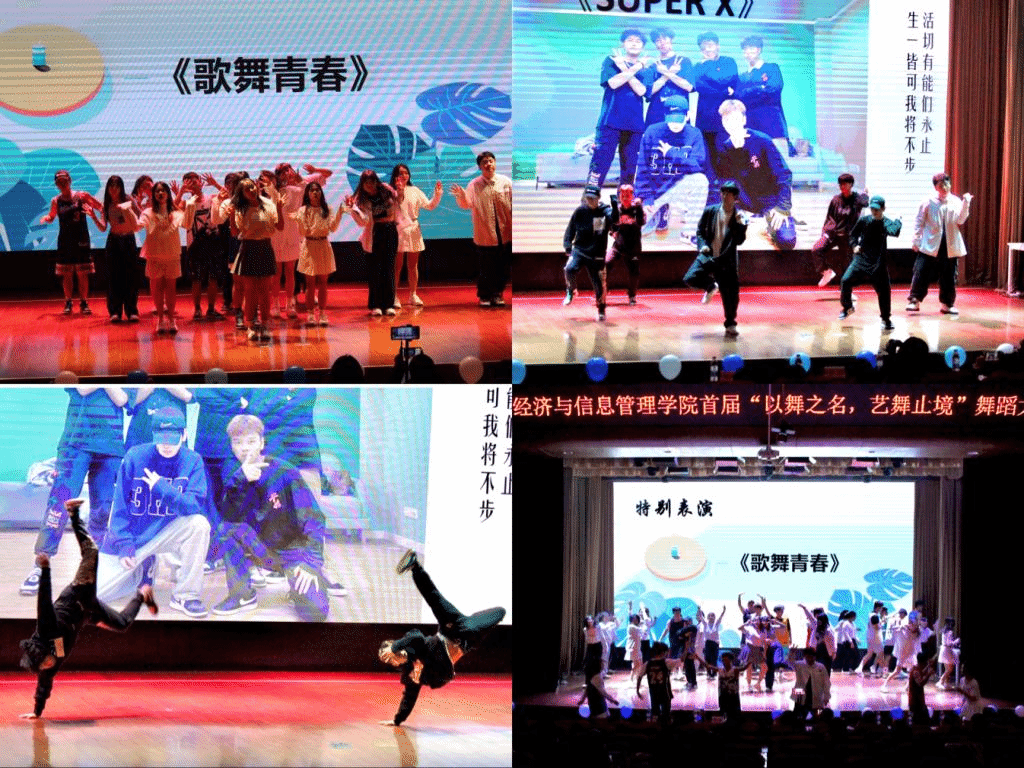 青春爱舞,狂舞青春。为丰富我校学生业余生活,加强学校精神文明建设,展示当代大学生风采,提高大学生鉴赏美之能力,为每一位舞蹈爱好者提供展示自我之平台。我院于12月10日晚上八点于下里巴人剧场隆重举行数字经济与信息管理学院首届“以舞之名· 艺无止境”舞蹈大赛。本次大赛邀请到数字经济与信息管理学院副院长任瑞娟老师;团总支书记马莉老师;艺术修养与实践版块指导老师路丽帆老师;志愿服务版块指导老师彭薇薇、王瑞老师;社团活动版块指导老师张婷、刘琳老师;竞技体育版块指导老师汪立、吴生亮老师;宣传推广版块指导老师曹文扬老师作为评委出席。