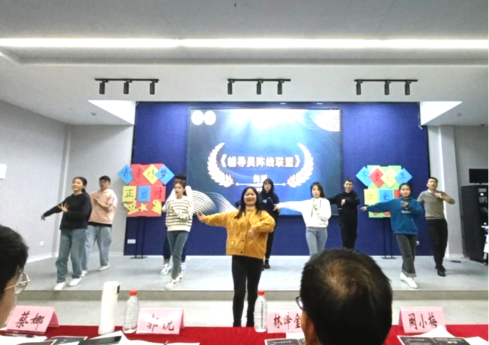 中场休息时分,现场评委和观众突然沸腾了起来。全体辅导员老师和班导师代表走上舞台中央,跟随着音乐跳起了舞蹈《辅导员阵线联盟》,同学们跟着辅导员老师们的节奏欢快跳跃了起来,欢呼声、加油声、呐喊声此起彼伏,现场氛围也在辅导员节目中抵达了小高潮。