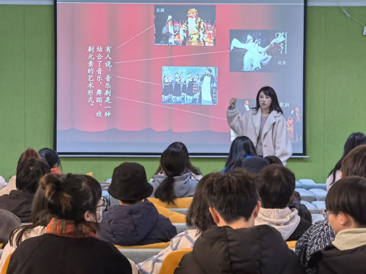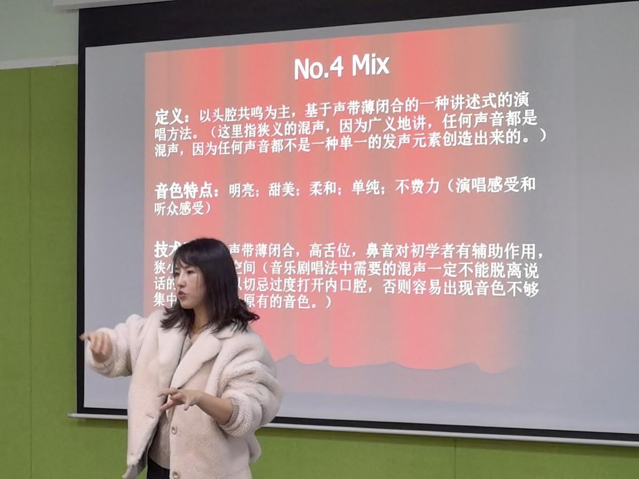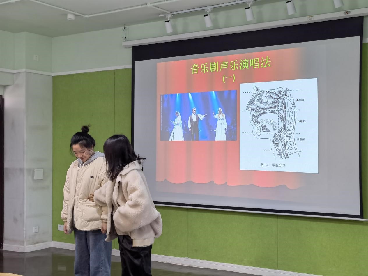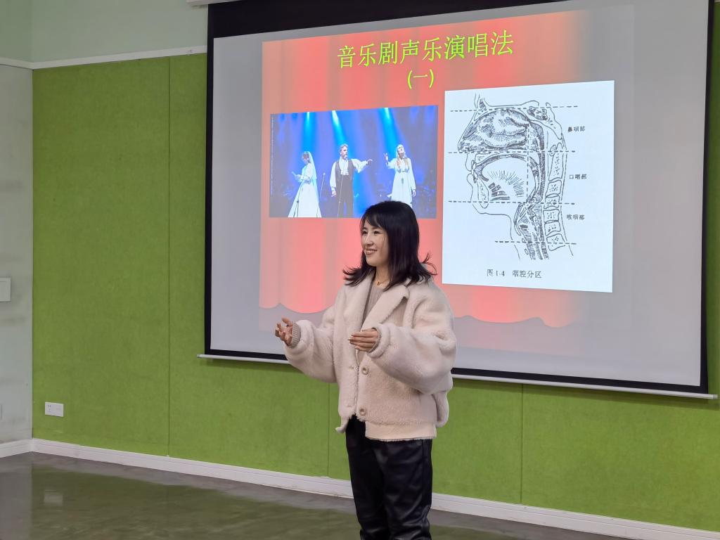 音乐是人生的艺术。吴娇老师以音乐剧片段为引,带领同学们学习气息的运用以及如何使用正确的位置发声,并阐述多种发音方式,包括混合声音法、鼻腔共鸣法等,对音乐剧涵盖的艺术形式进行解析,让同学们合理运用各种演唱技巧,增强音乐表现能力。在老师的认真讲解下,氛围逐渐变得轻松起来,同学们积极与老师互动,在感受音乐剧魅力的同时,也获取到丰富的乐理知识。