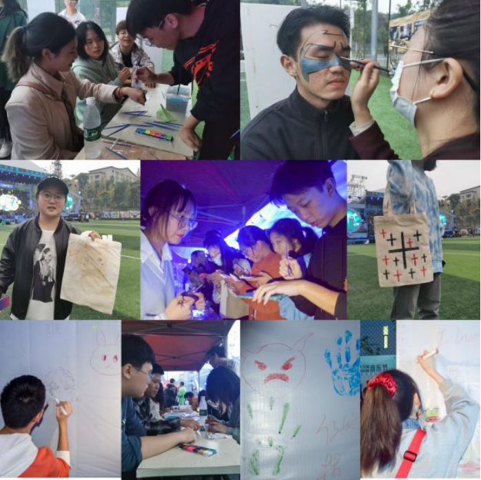 如果说世界上真有一种语言是无论时空、种族、国界都能懂的,毫无疑问,那就是音乐。但如果再给音乐加上色彩,又会是怎样的情况呢?为了响应2021年“大学城•钓鱼城”国际音乐节(合川校区)的开展,大数据与软件学院于2021年10月25日晚上6点,于D区五人制足球场开展了“引音作墨·执笔为画”帐篷音乐节彩绘外围活动,本次活动将色彩与音乐相结合,以视觉上的冲击带大家一同感受这奇妙的视听盛宴。