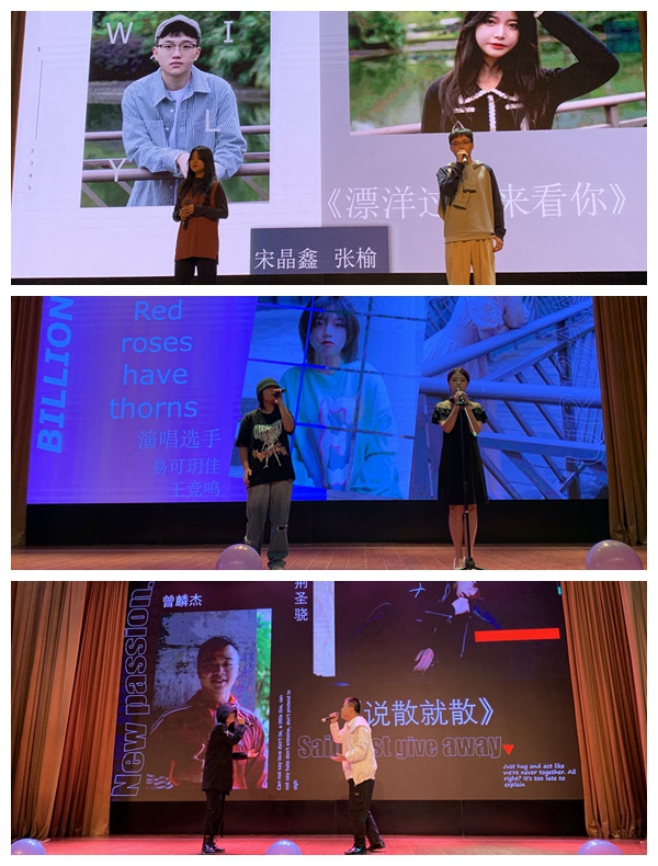 经过初赛、复赛的激烈角逐和选拔,脱颖而出的13名选手以饱满的热情为观众带来了精彩绝伦的视听盛宴。开场舞结束后,张榆和宋晶鑫同学用一首《飘洋过海来看你》将观众带进音乐的世界,在歌曲的旋律中体会别样的爱情。而《红玫瑰》又将象征着白玫瑰的易可玥佳同学与如红玫瑰一般明艳的王竞鸣同学紧紧的结合在一起,在歌曲结束之际你是否从这首歌中做出最后的抉择。