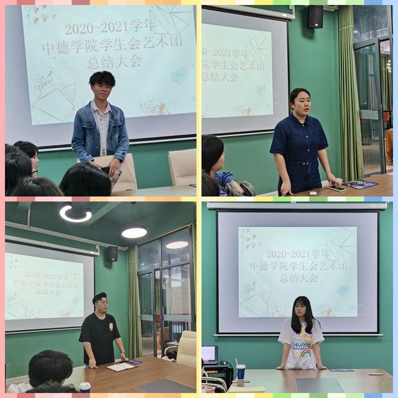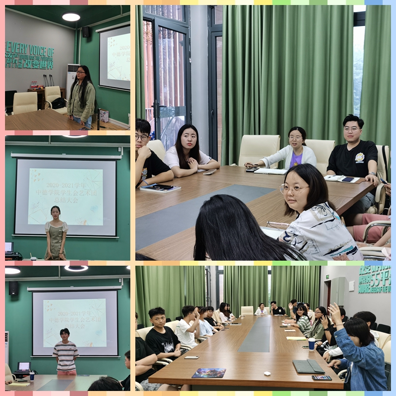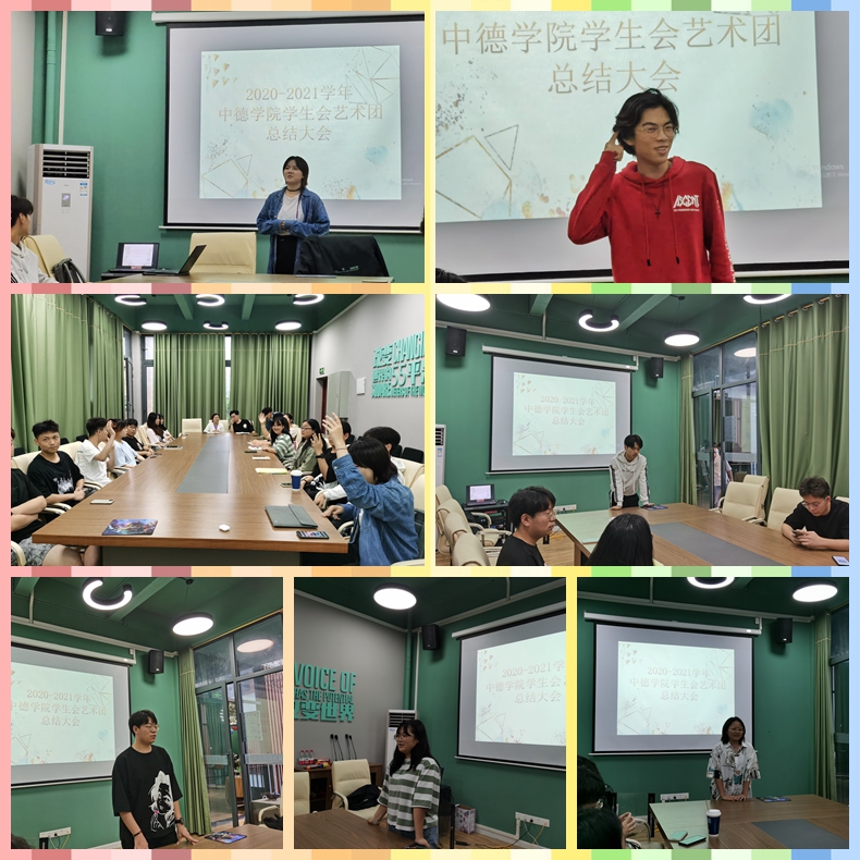 永远年轻,永远相信梦想,永远热泪盈眶。中德应用技术学院学生会艺术团于6月9日16:00,在花果书院201会议室召开了2020-2021学年总结大会。出席本次总结大会的有肖瑶老师和艺术团团长杨继欣同学、徐景越同学、万美伶同学、陈泊文同学及艺术团干事,本次总结例会与以往都大不相同,它是以交流分享的方式进行。