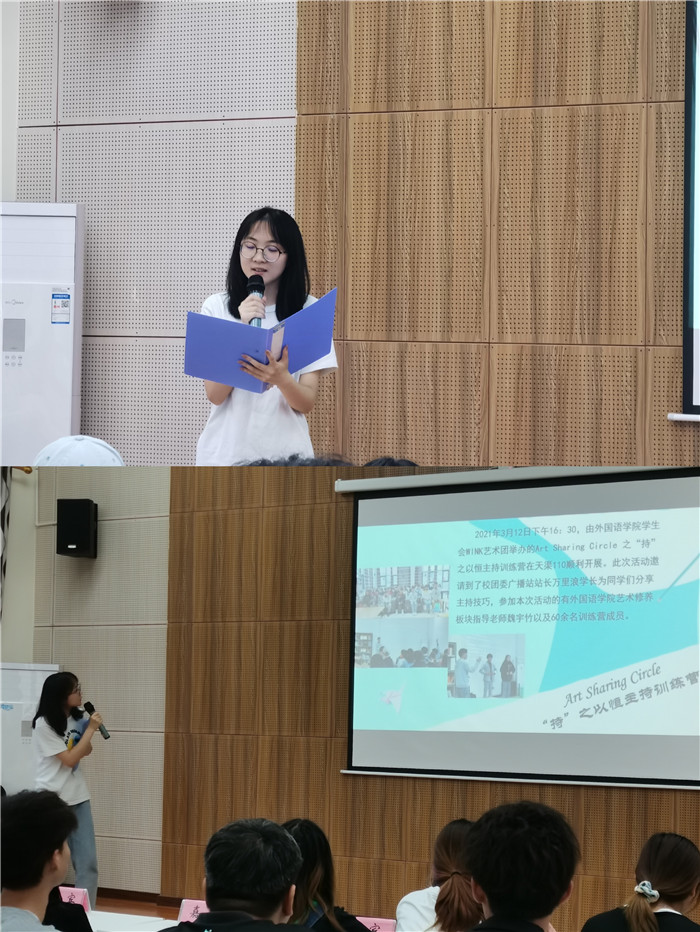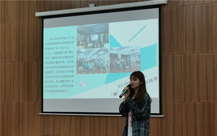 为营造外国语学院基层艺术学习氛围,展示Art Sharing Circle训练营成员这一学年的训练成果。2021年6月9日下午16:30,由外国语学院WINK艺术团举办的Art Sharing Circle训练营成果展在天渠报告厅111顺利开展。此次分享会出席的有校园社团活动板块指导老师兰鹰老师、艺术修养板块指导老师魏宇竹老师、外国语学院学生会主席杨晓莉学姐以及100余名训练营成员。