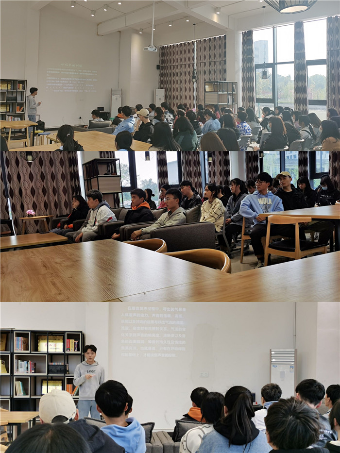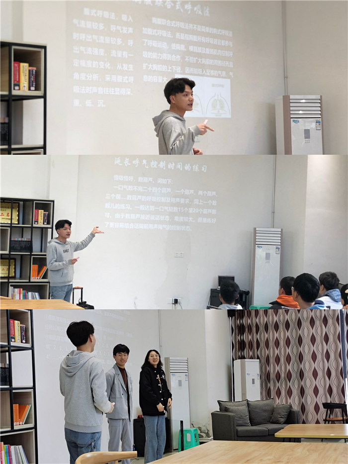 活动开始,万里浪学长直切主题,为同学们讲解了一些关于主持气息控制的方法。他指出:在发声过程,呼出的气息是人体发声的动力。学长提出不同人会有不同的呼吸方法,大概分为:胸腔式呼吸法、腹式呼吸法以及最难达到的胸腹联合式呼吸法。其中,万里浪学长推荐大家采用腹式呼吸,因为这种呼吸法会让声音更加深重、低沉且富有磁性,从而让观众能与主持人产生情感上的共鸣。学长也指出只要是能让自己舒服的呼吸法,再加上自我的活用一定可以成为最好的呼吸方式。三个呼吸法中万里浪学长指出腹腔联合式呼吸法有难度且需要不停的练习,要有持之以恒的决心,但是一旦坚持下去,经过时间的打磨,那么腹腔式呼吸法也可以掌握和胜任了。万里浪学长亲自为同学们生动形象的讲述以及亲自示范,让同学们认识到了呼吸控制的奇妙之处。