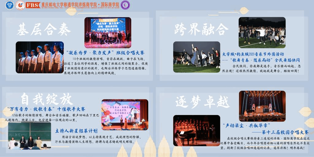 本学期商院艺术修养与实践围绕生态圈层,展开一系列艺术活动,策划举办第四届十佳歌手大赛、第四届班级合唱大赛,强调基层活力,鼓励我院1300余名学子加入到艺术实践中,同时让本院系的优秀艺术人才得以表现;积极响应音乐节的开展,联动我校舞蹈社举办全民舞蹈快闪,打造与众不同的特色活动;首次成立主持人新星计划库,招募商院优秀主持16人,在创新中提升艺术实践活动开展的路径,使商院艺术更多元化,更具吸引力。参与第十三届校园合唱大赛,与艺术教育中心专业老师对接指导,提高艺术活动专业性,让同学们在更大的舞台上展现自我,释放自我,逐梦卓越!