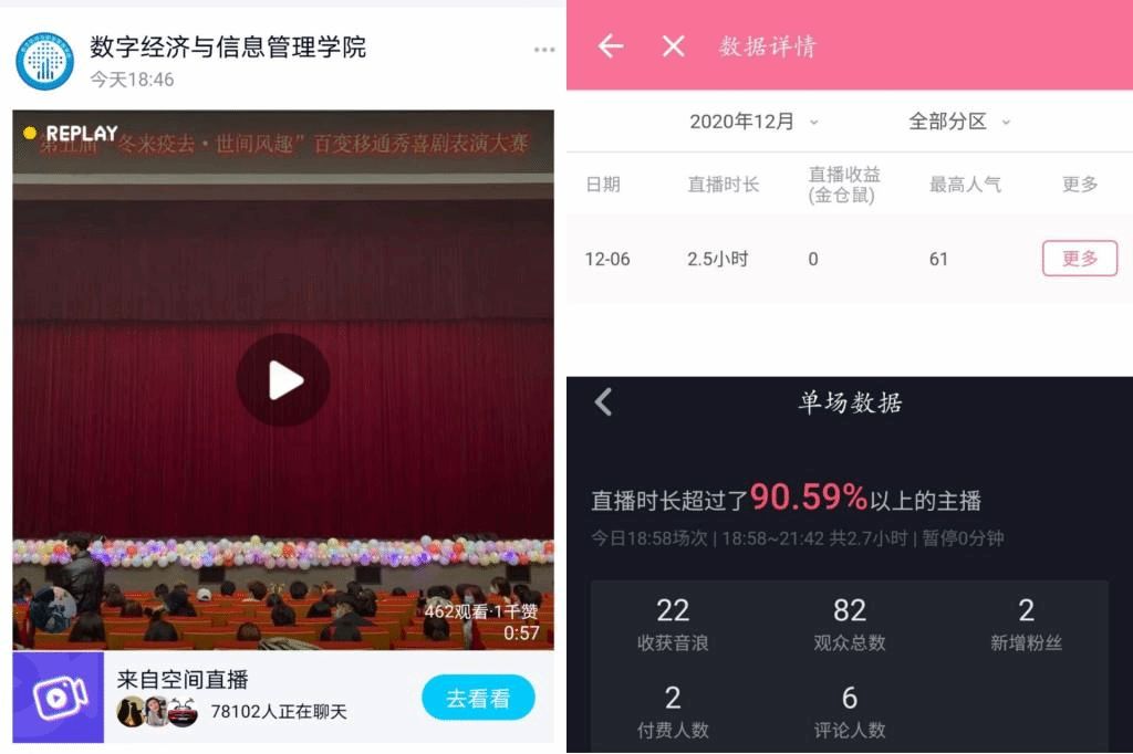 本次百变移通秀采取线上线下相结合的方式进行,在官方QQ、抖音短视频、哔哩哔哩直播三个直播平台同步直播。总计观看人数500余人,点赞次数达1千多次。参赛队伍演出之前,校乐团的没头脑乐队给大家带来摇滚音乐《只有音乐才是我的解药》和《自由》,在他们动感的节拍下,即刻点燃了在坐同学们的热情,带动了现场氛围!比赛,就此拉开帷幕!