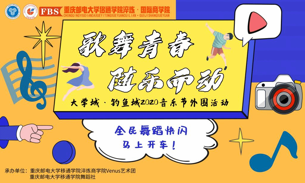 大学城·钓鱼城2020音乐节外围活动“歌舞青春·随乐而动”全民舞蹈快闪到这里就圆满结束了,每个人的成长过程中都需要有放飞自我,挣脱束缚的经历。而本次活动也大力营造了积极向上的校园艺术文化氛围,为当代大学生提供了展示奋发有为,朝气蓬勃的青春风采平台。“快闪舞蹈show”的校园行为艺术带动了大家的个性化表达,梦想就在手中,未来就在手中,就让我们一起歌舞青春,以待流年!