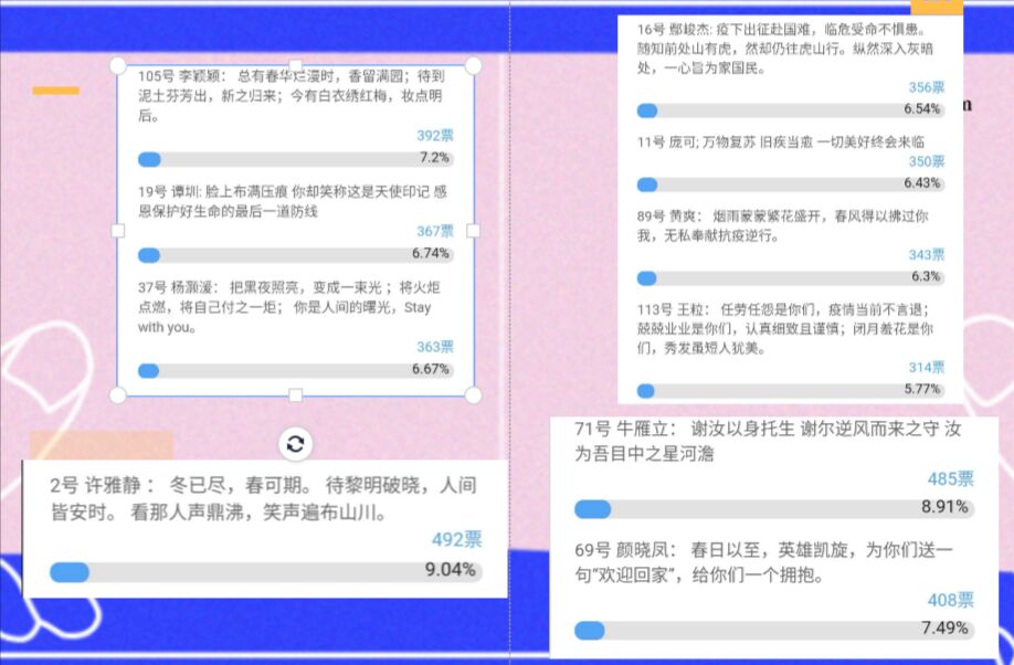 到了活动后期,所有的投稿同学进入到了紧张激烈的拉票环节,每个同学通过网络拉票的形式再次传递了对面对疫情时,共赴难关的乐观态度。打看投票通道,满屏流露出的都是对奋战在一线的医护人员的感激之情;对战胜疫情的坚定信心;对美好未来的向往之情。“冬已尽,春可期。待黎明破晓,人间皆安时,看那人生鼎沸,笑声遍布山川。”表达了对冬去春来,一切平息,到处一片祥和的向往之情。“谢汝以身托生,谢尔逆风而来之守,汝为吾目中之星河澹。”表达了对每个医护人员逆风而行用生命保卫生命的敬重。一句句朴素的话语,溢出的确是满满的爱。
