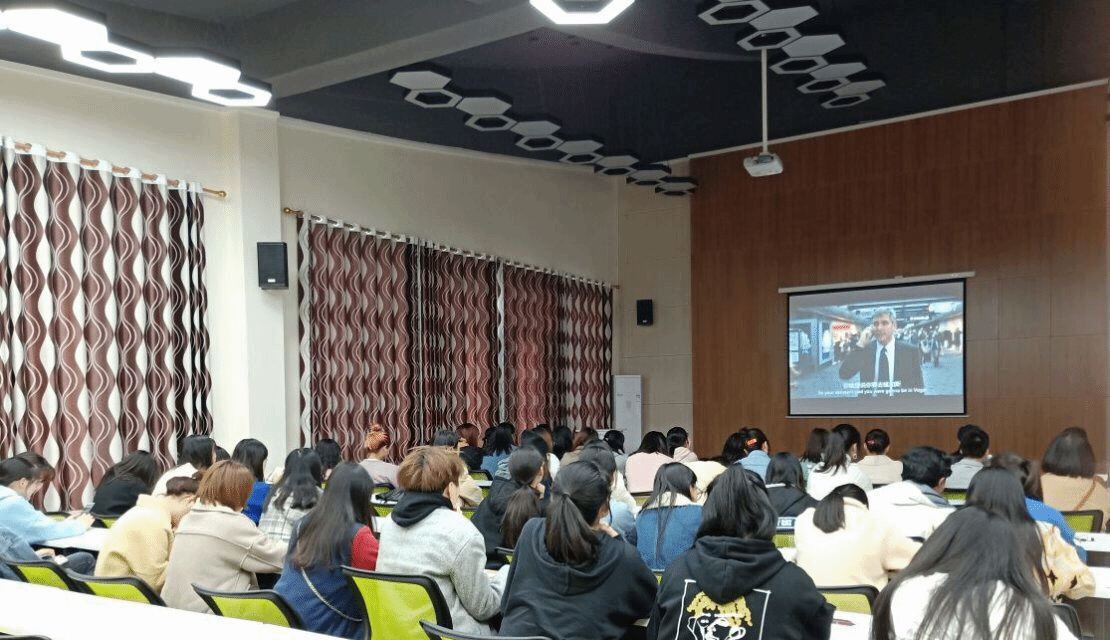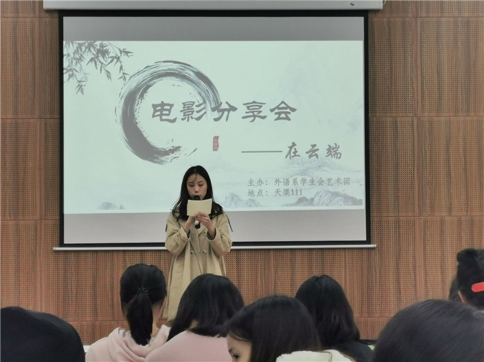电影是由活动照相术结合幻灯放映发展起来的一种综合性现代艺术。2019年11月13日下午16:20,由外语系WINK艺术团主办的艺术修养活动国外影视分享会在天渠111(报告厅)开展。参加此活动的嘉宾有外语系艺术修养与实践指导老师谭雯、电影协会社长欧阳琪、邓雅珲同学以及报名参与此次分享会的同学们。