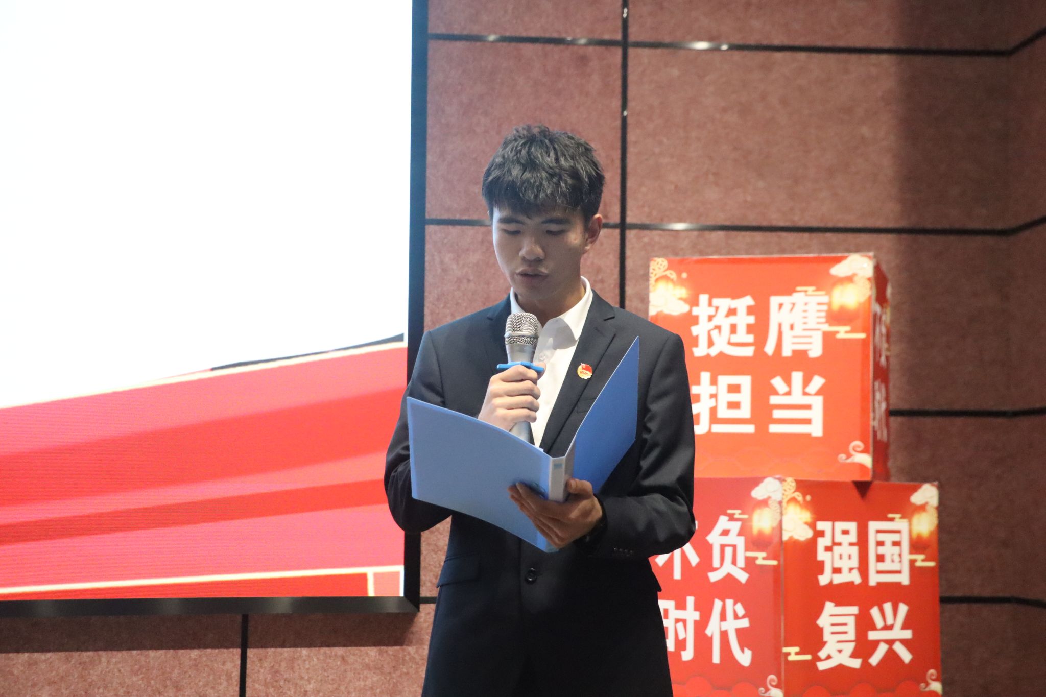 不负青云之志,永存赤子之心。“全体起立,奏唱中华人民共和国国歌”。主持人话音落下后,全体肃立,庄严奏唱,高亢的歌声余音绕梁,青年们热情饱满,用激昂的歌词唱出新时代青年的“发声”,大会在庄严的国歌声中拉开序幕。