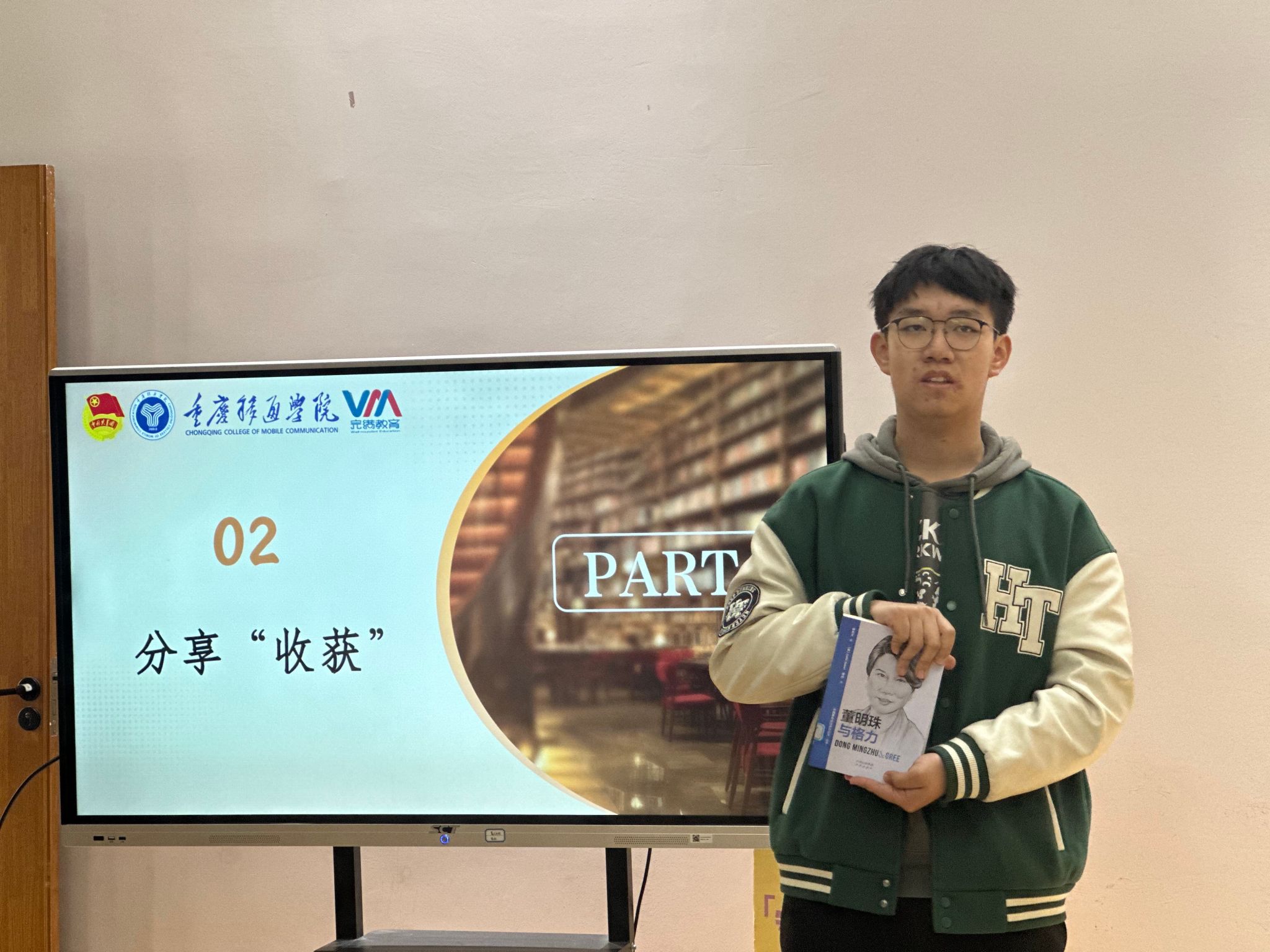 在主持人的邀请下,秘舟同学也向大家推荐了《董明珠传》,介绍了董明珠从不被看好的业务员一直奋斗到董事长的经历。董明珠的领导风格独具魅力,她的眼光独到,胆识过人。在她的引领下,格力电器不再满足于成为一家传统的电器制造企业,而是通过不断创新和多元化发展,赢得了市场的认可和尊重。她敢于突破传统,勇攀高峰,为格力电器注入了源源不断的活力和创造力。展示了其坚韧不屈的精神和中国女性的风采。秘舟同学告诉大家只有勇于创新,敢于挑战,并且怀有对社会的责任感与担当精神才有可能成功。