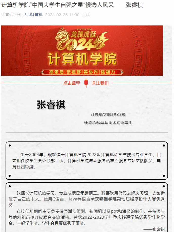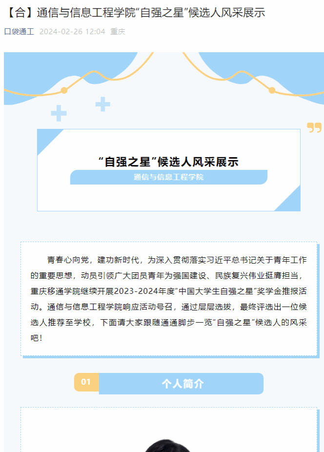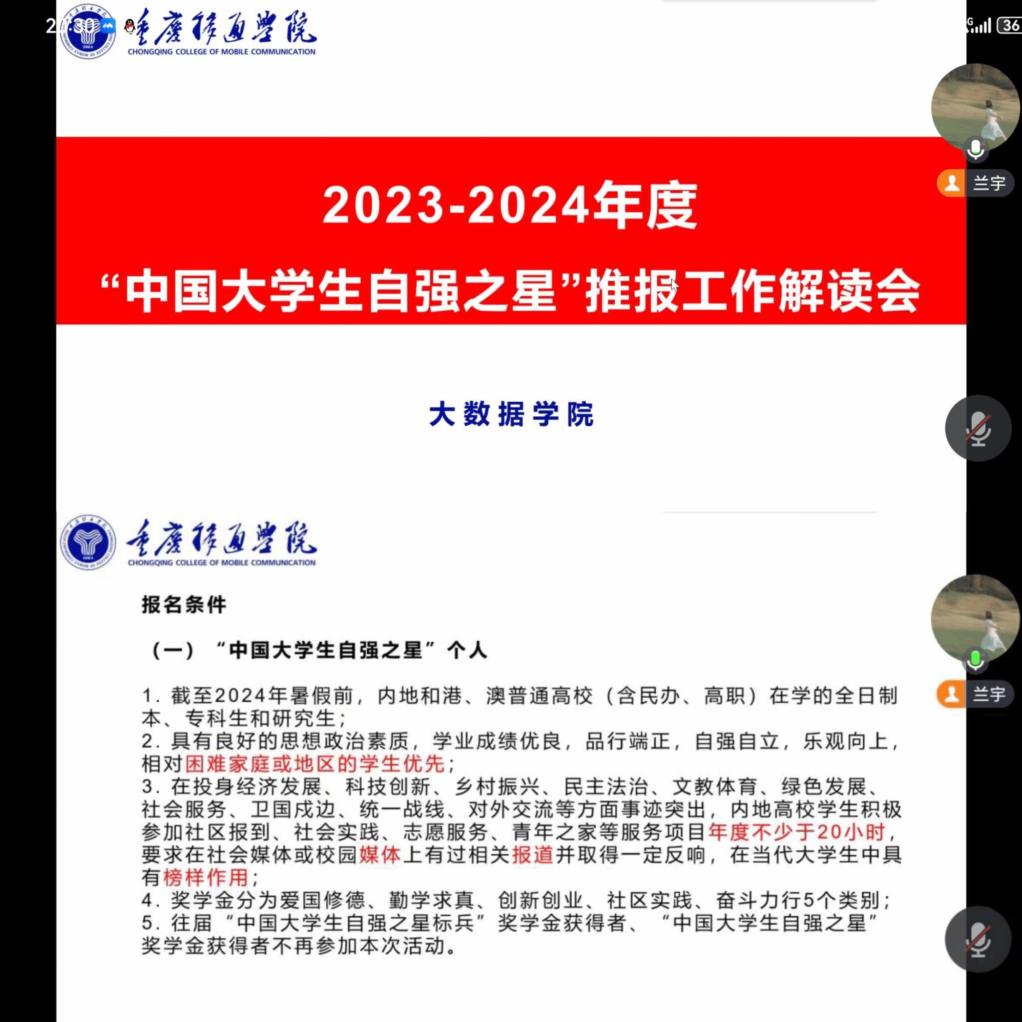 为深入贯彻落实习近平总书记关于青年工作的重要思想,动员引领广大团员青年为强国建设、民族复兴伟业挺膺担当,在广大青年群体中厚植爱党、爱国、爱社会主义的情感,根据团中央、全国学联《2023—2024年度“中国大学生自强之星”奖学金项目说明书》和团市委《关于组织开展2023-2024年度重庆市“大学生自强之星”奖学金项目推报工作的预通知》相关要求,校团委下发关于组织开展2023-2024年度重庆移通学院“中国大学生自强之星”推报工作(预通知),指导各二级学院做好“大学生自强之星”活动宣传发动,组织开展推报工作解读会。