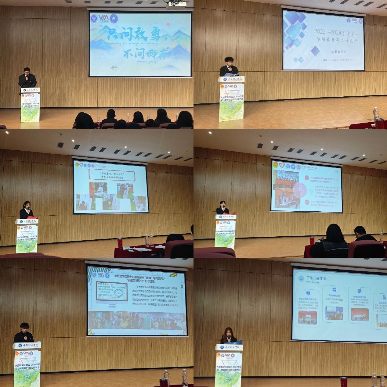 各学生组织对本学期工作情况进行如实汇报,随着本学期的结束,学生组织的工作也即将告一段落,在这一学期中各学生组织开展各项完满活动,不仅丰富了同学们的课余生活,也提高了同学们的综合素质。同时,还促进了各部门之间积极合作,加强了各部门的沟通交流,提升了各部门的凝聚力和向心力。
